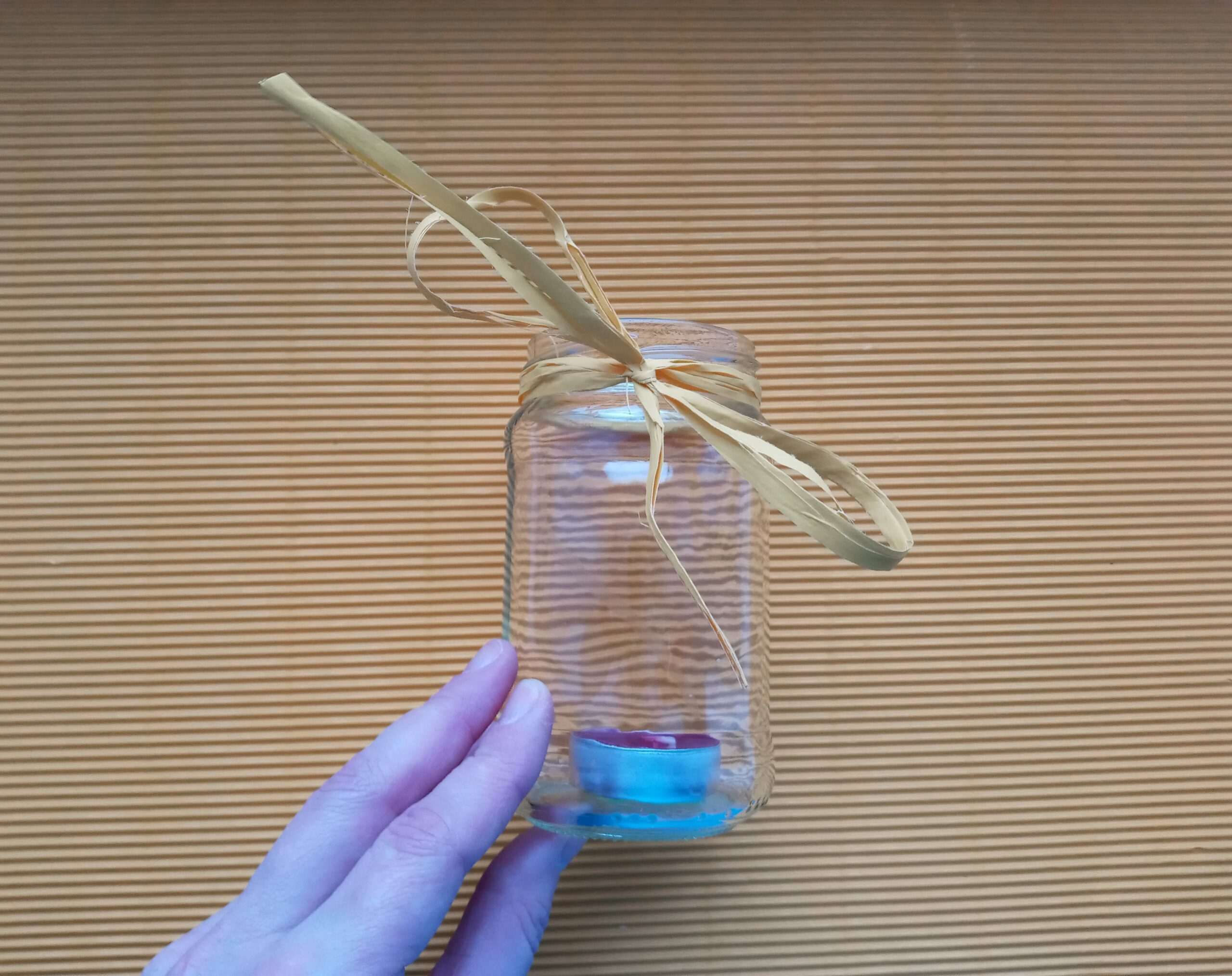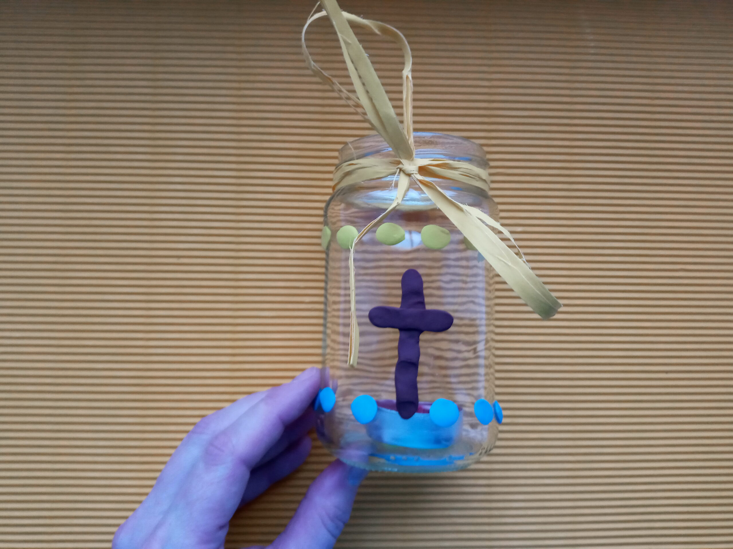 Do świecy od spodu przyklejamy plastelinę, a następnie umieszczamy na dnie słoika. Dociskamy świecę, by mocno przykleiła się do naczynia. U góry słoika zawiązujemy wstążeczkę. Potem przyklejmy na zewnętrznej stronie słoika elementy uformowane z plasteliny. Mogą to być gwiazdki, serduszka, kropeczki, krzyż, aniołek lub choinka. Bądź kreatywny i twórczy ozdabiając swój lampion. Możesz wziąć gotowy lampion i udać się na roraty!