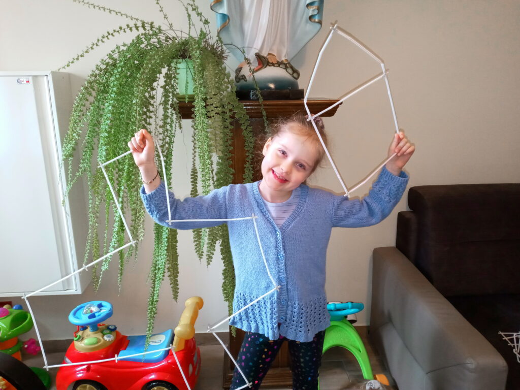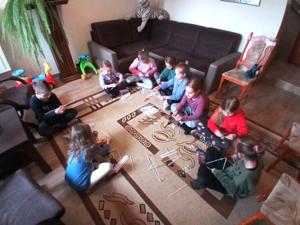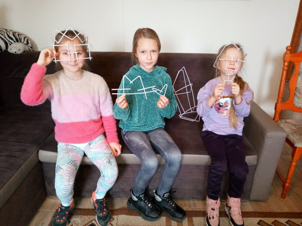 Na zakończenie spotkania rozwijaliśmy naszą wyobraźnię oraz kreatywność. Każde dziecko otrzymało zestaw słomek do napojów oraz krzyżykowe łączniki. Zadaniem uczestników było stworzenie dowolnej figury przestrzennej. Dzieci zrobiły ze słomek różne przedmioty: między innymi okulary, koronę na głowę, pojazd kosmiczny oraz inne pomysłowe rzeczy.