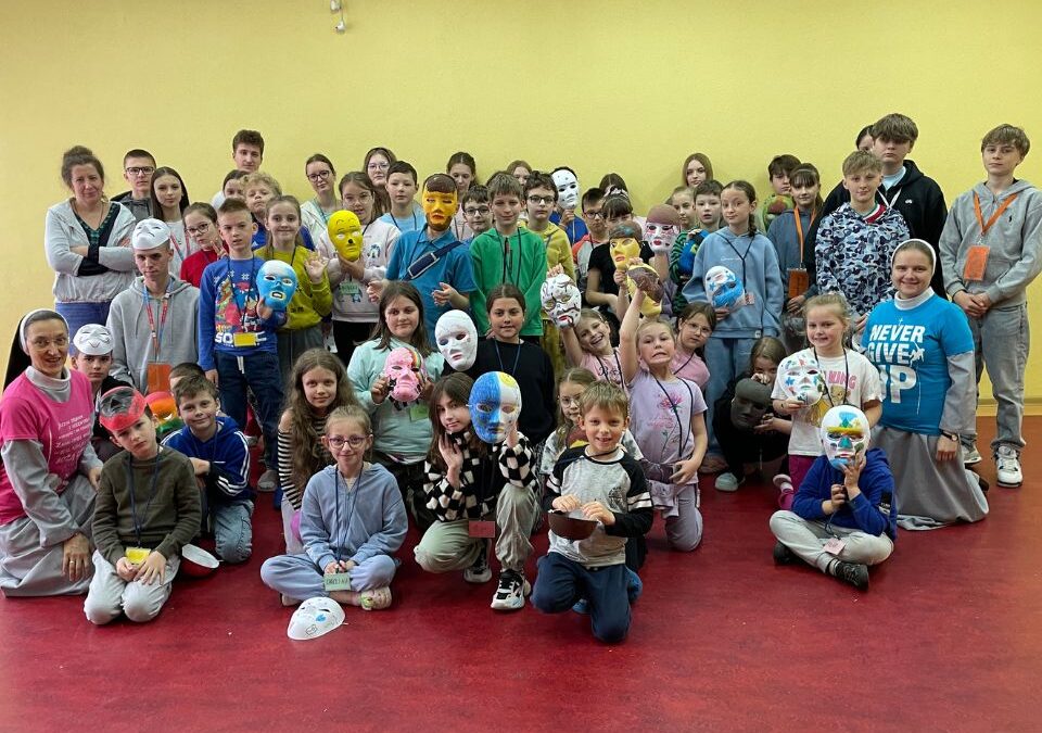 2025-05-20W sobotni poranek, 17 maja, pogoda w Suwałkach przywitała nas bardzo deszczowym i zimnym akcentem. Kiedy wybiła godzina 9, u Sióstr Terezjanek na Artyleryjskiej powoli robiło się tłoczno. Uczestnicy warsztatów artystyczno – formacyjnych wraz z wolontariuszami i siostrami rozpoczęli ostatnie w tym roku szkolnym spotkanie warsztatowe. Na początku nieco sennie przywitaliśmy się, a następnie w czasie modlitwy poprosiliśmy Pana Jezusa o dobry dzień dla nas. Pierwsza część spotkania polegała na lepszym poznaniu siebie nawzajem. Każdy uczestnik miał za zadanie wymieć trzy „fakty” o sobie, następnie animatorzy grup podkreślali te rzeczy, które nas łączą. Kolejnym zadaniem było podejście do rozłożonych na podłodze kolorowych kół i narysowanie na nich emotikonki, która odzwierciedlała nasze samopoczucie. Po tym zadaniu, w grupach uczestnicy animowani przez wolontariuszy dzielili się jak się dziś czują, dlaczego wybrali taki a nie inny kolor, co lubią i co jest dla nich ważne. Odkryliśmy, że każdy z nas jest oryginalną i niepowtarzalną osobą. Po pracy w grupie przyszedł czas na II śniadanie. Następnie rozpoczęliśmy warsztat artystyczny. Każdy z uczestników i wolontariuszy otrzymał białą maskę. Wspólnie doszliśmy do wniosku, że takie maski niczym się nie różnią. Postanowiliśmy to zmienić i tak je pokolorować i ozdobić, żeby było jasne do kogo należy dana maska. Aby wyrazić jacy jesteśmy używaliśmy ulubionych kolorów i motywów.