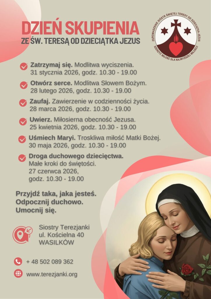 2026-01-29W roku 2026 zapraszamy kobiety od 18. roku życia na comiesięczne dni skupienia, które będą się odbywać w domu sióstr Terezjanek w Wasilkowie w ostatnią sobotę każdego miesiąca. Będzie to czas zatrzymania się, oddechu i spotkania z Bogiem w ciszy serca – z dala od pośpiechu, nadmiaru obowiązków i codziennego napięcia.
