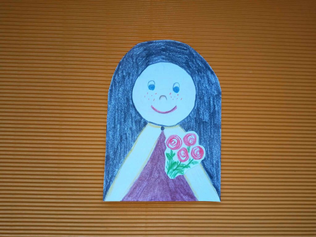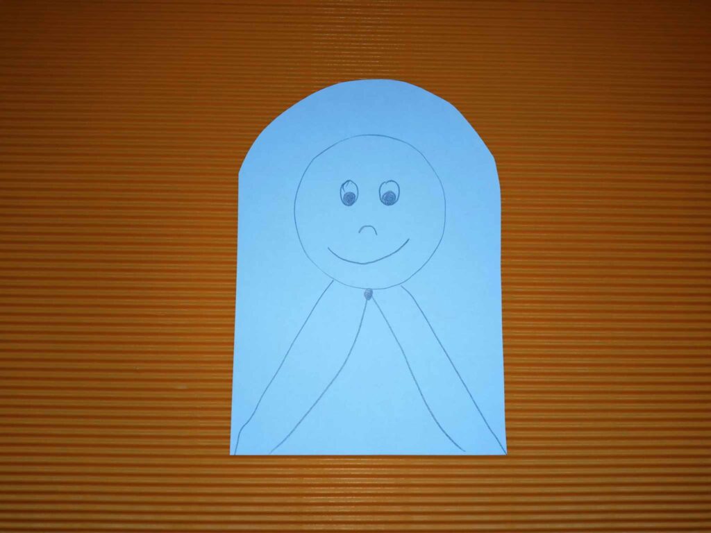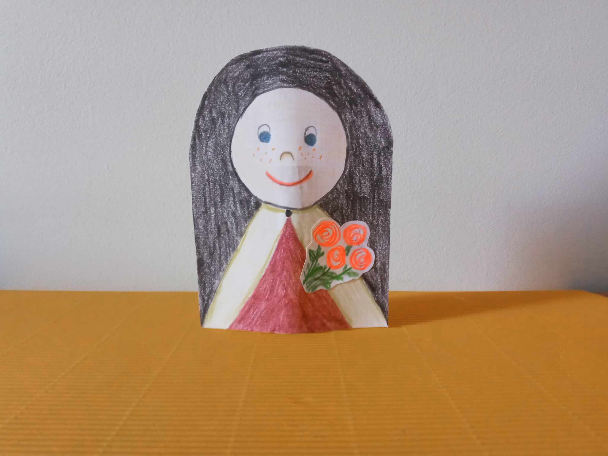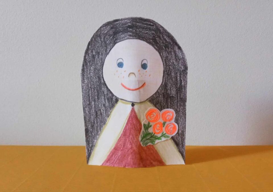 Kartkę z bloku A4 składamy na cztery części i rozcinamy. Bierzemy 1/4 kartki i na górze rysujemy ołówkiem zaokrąglony łuk (możesz odrysować kubeczek lub szklankę). Następnie wycinamy zaokrąglenie i rysujemy ołówkiem twarz św. Teresy, habit i płaszcz. Wszystko kolorujemy kredkami lub flamastrami. Potem na kartce rysujemy bukiet róż i wycinamy. Kwiaty przyklejamy do postaci św. Teresy. Na końcu z tyłu przymocowujemy klejem rolkę od papieru toaletowego, która będzie podpórką dla postaci św. Teresy. Teraz św. Teresę z Lisieux możesz postawić w widocznym miejscu w swoim pokoju, by przypominała ci o tym, że jest blisko ciebie i chce ci pomagać z nieba.