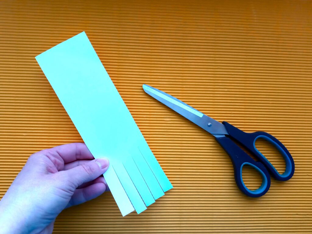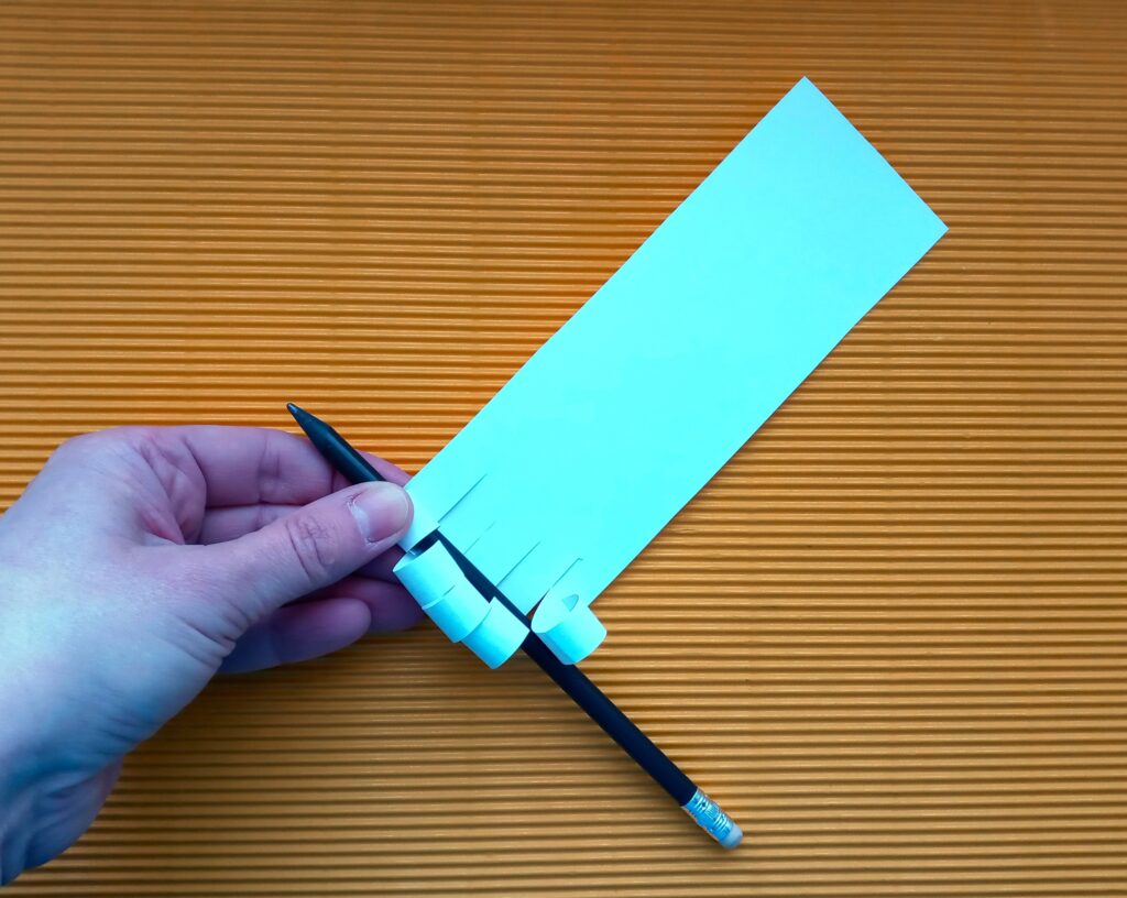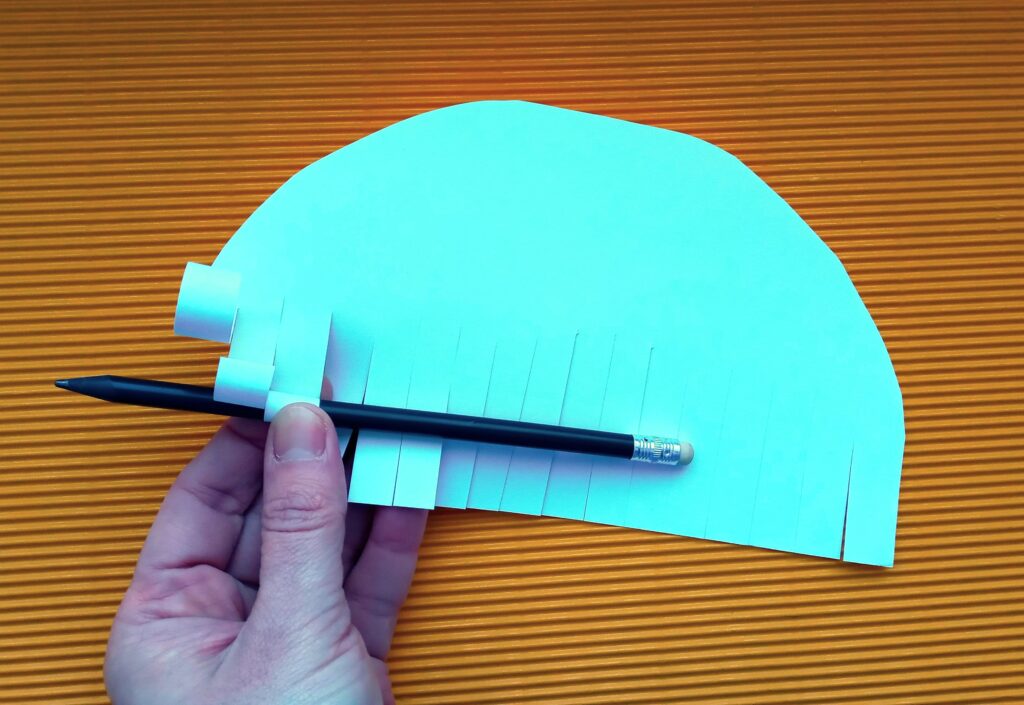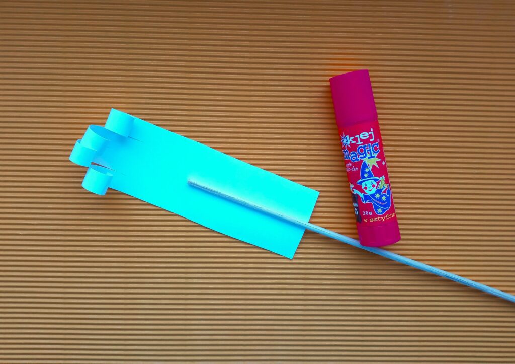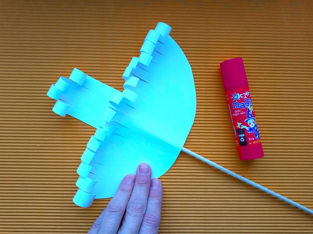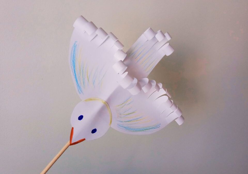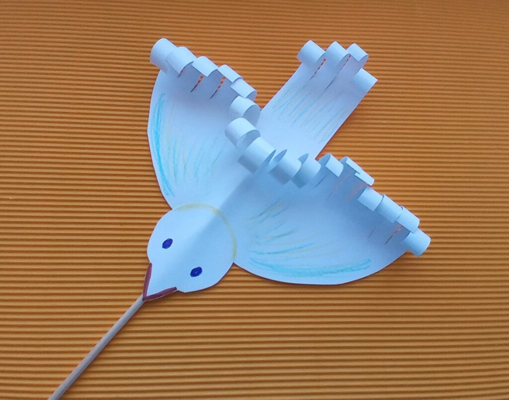 Z kartki papieru wycinamy pasek o szerokości ok. 12 cm. Następnie zaokrąglamy nożyczkami jedną z krawędzi, by przypominała kształtem skrzydła ptaka. Potem nacinamy nożyczkami paski o szerokości 1 cm i długości ok. 5 cm. Każdy pasek zakręcamy przy pomocy ołówka, by powstały piórka. Teraz przystępujemy do wykonania ogona. Wycinamy z papieru pasek o szerokości ok. 5 cm i na jednej z końcówek nacinamy paski, podobnie jak robiliśmy to na skrzydłach. Zakręcamy przy pomocy ołówka piórka. Później rysujemy głowę gołębicy, wycinamy i dorysowujemy dzióbek oraz oczy. Można również pokolorować skrzydła i ogon, by ozdobić naszego ptaka. Na samym końcu sklejamy wszystkie elementy klejem.