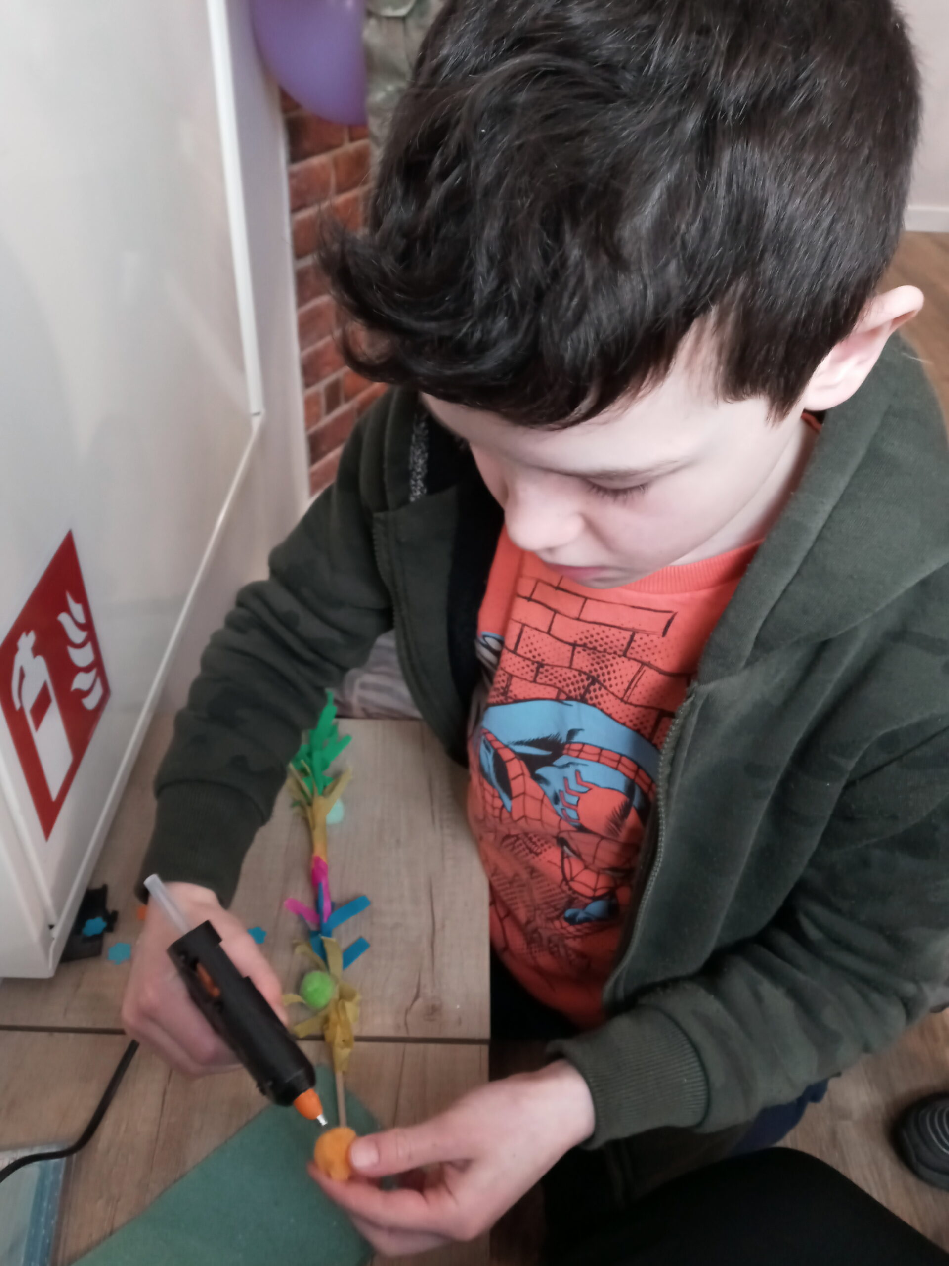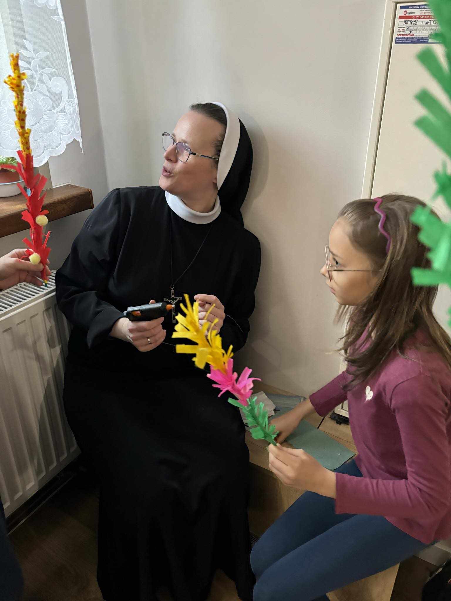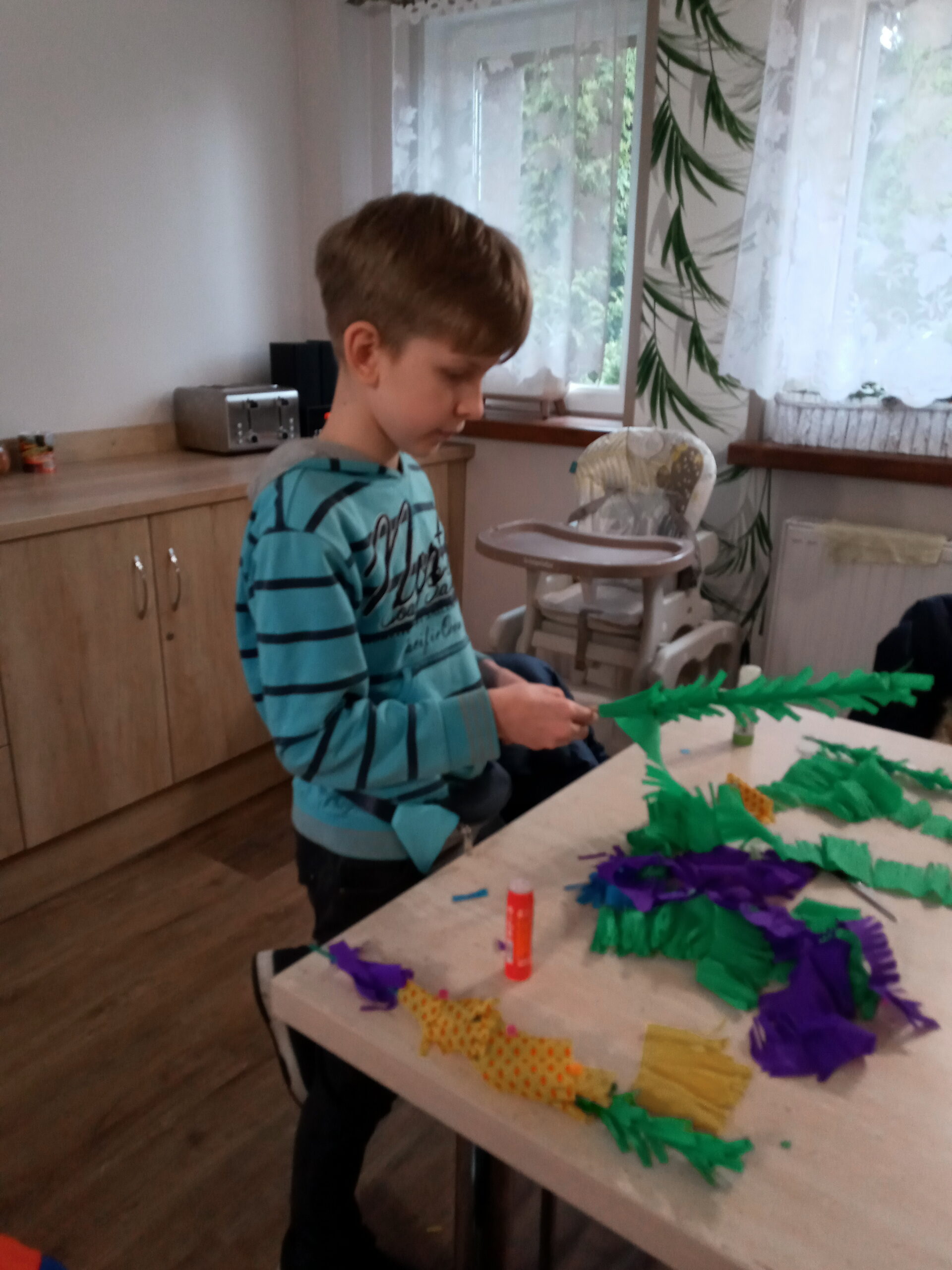 Każde dziecko przygotowało potrzebne materiały, by następnie przystąpić do kreatywnej pracy. Palemki robiliśmy z patyczków i kolorowej bibuły, a potem ozdabialiśmy je kwiatkami, motylkami, kurczaczkami i innymi wielkanocnymi ozdobami. Młodsze dzieci potrzebowały trochę pomocy, którą zapewniła im siostra Natalia Ozga CST.
