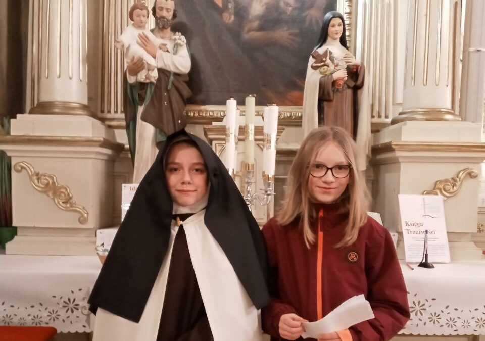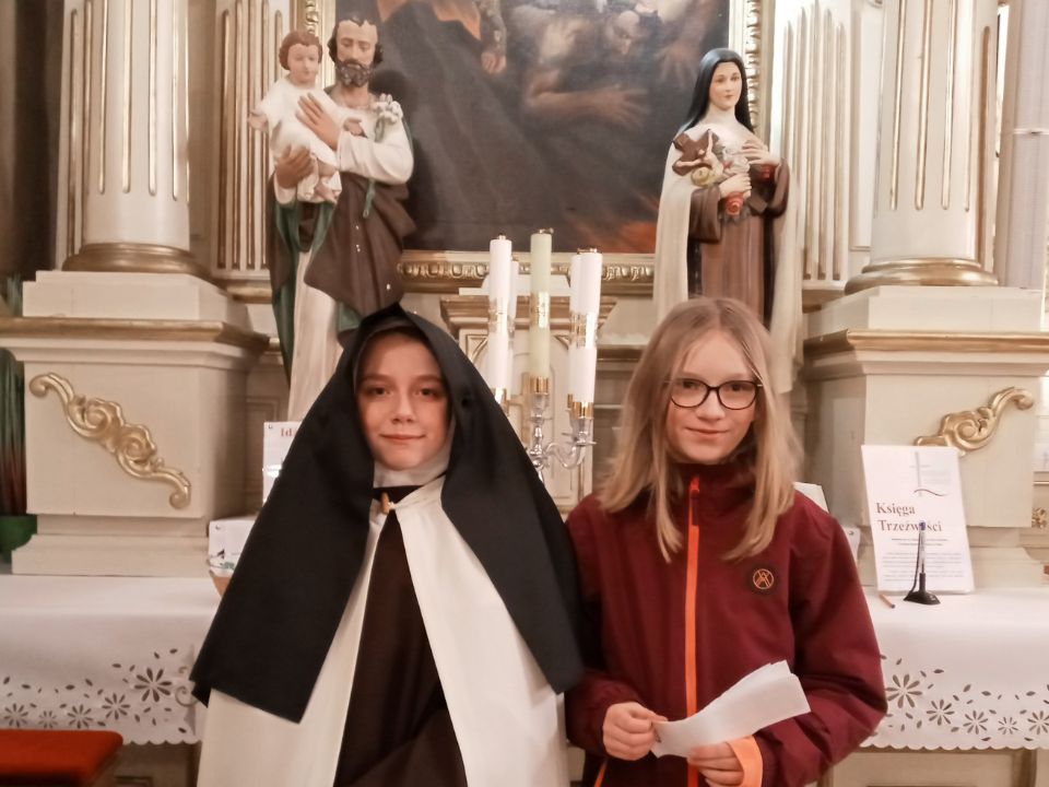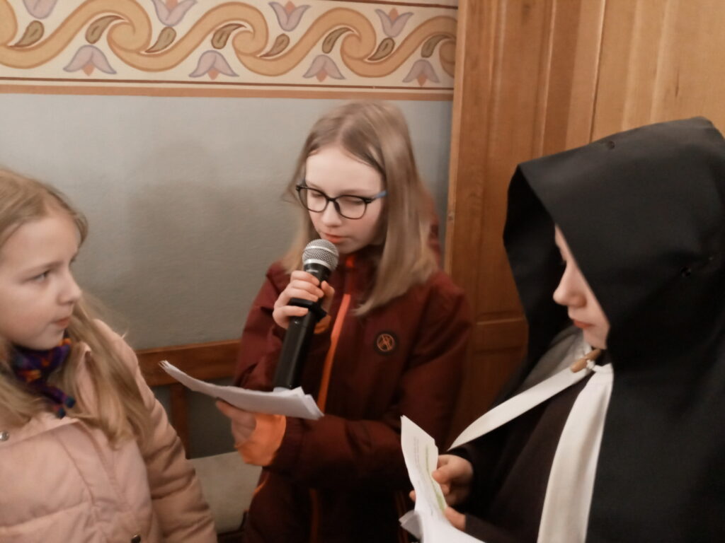 W rolę św. Teresy wcieliła się Karolina Kijas, a towarzyszyła jej Zosia Wilczyńska. Dziewczynki czytały rozważania do poszczególnych stacji drogi krzyżowej. Zosia relacjonowała, co działo się z Panem Jezusem, a Karolina przebrana w strój św. Teresy cytowała jej naukę o miłości i zaufaniu do Pana Jezusa.