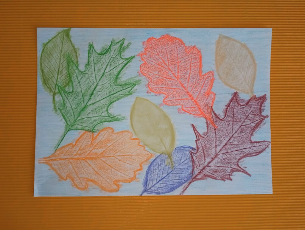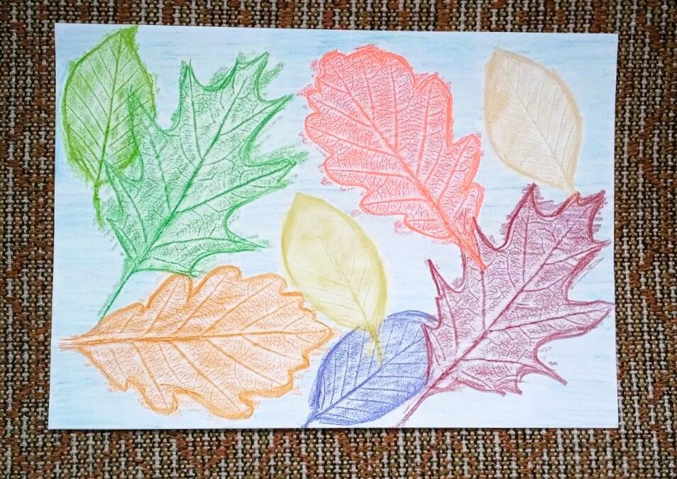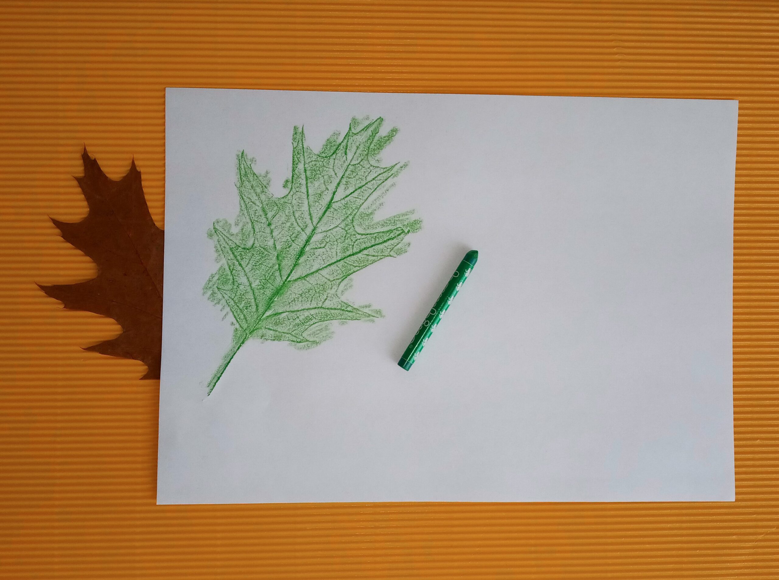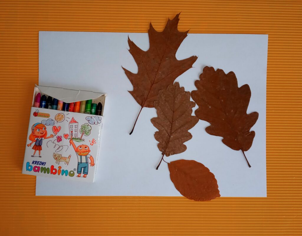Pod kartką z bloku rysunkowego układamy suszone liście. Następnie kredkami delikatnie kolorujemy papier, tak by odbiły się na nim kontury liści. Potem można jeszcze pokolorować w dowolnym kolorze tło. Jesienny obrazek jest już gotowy!