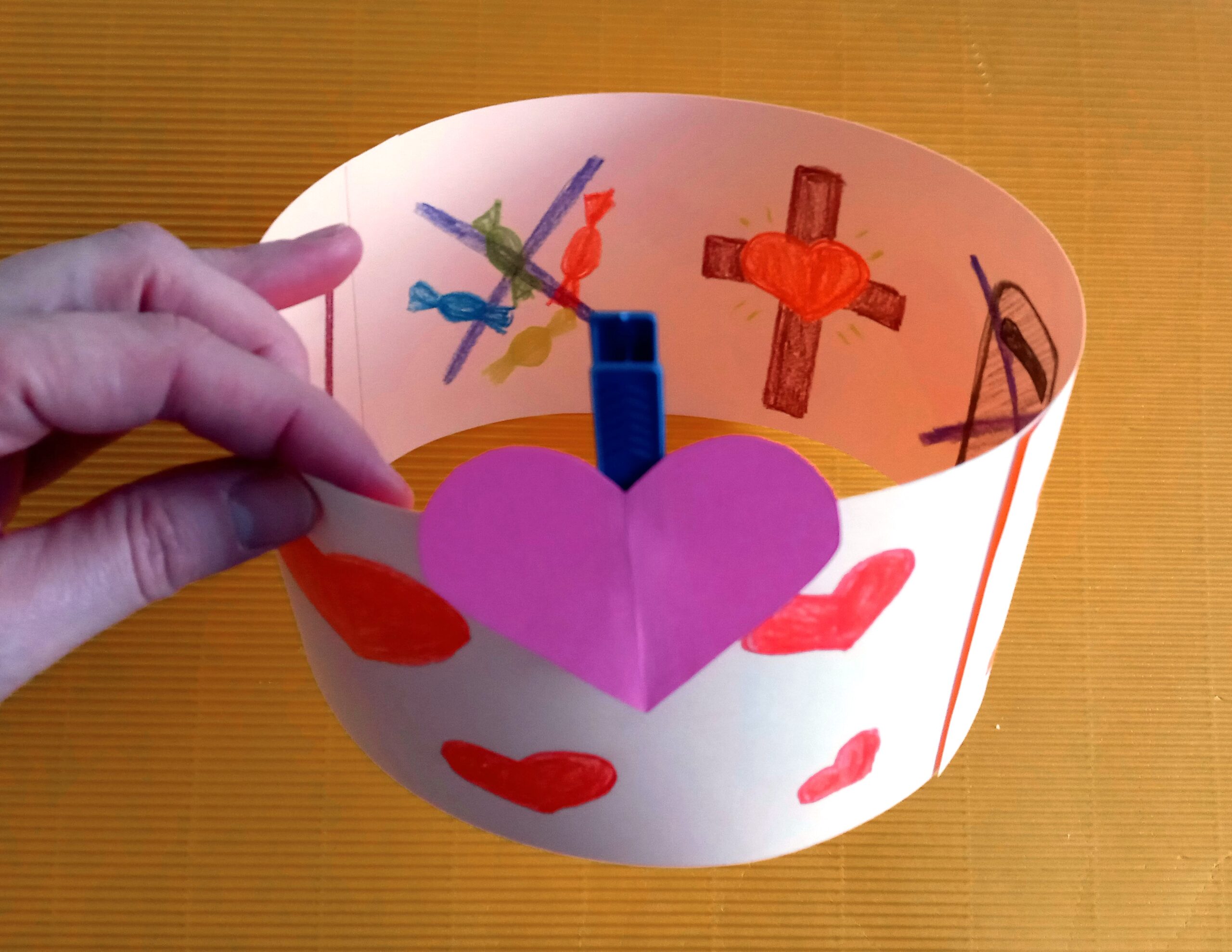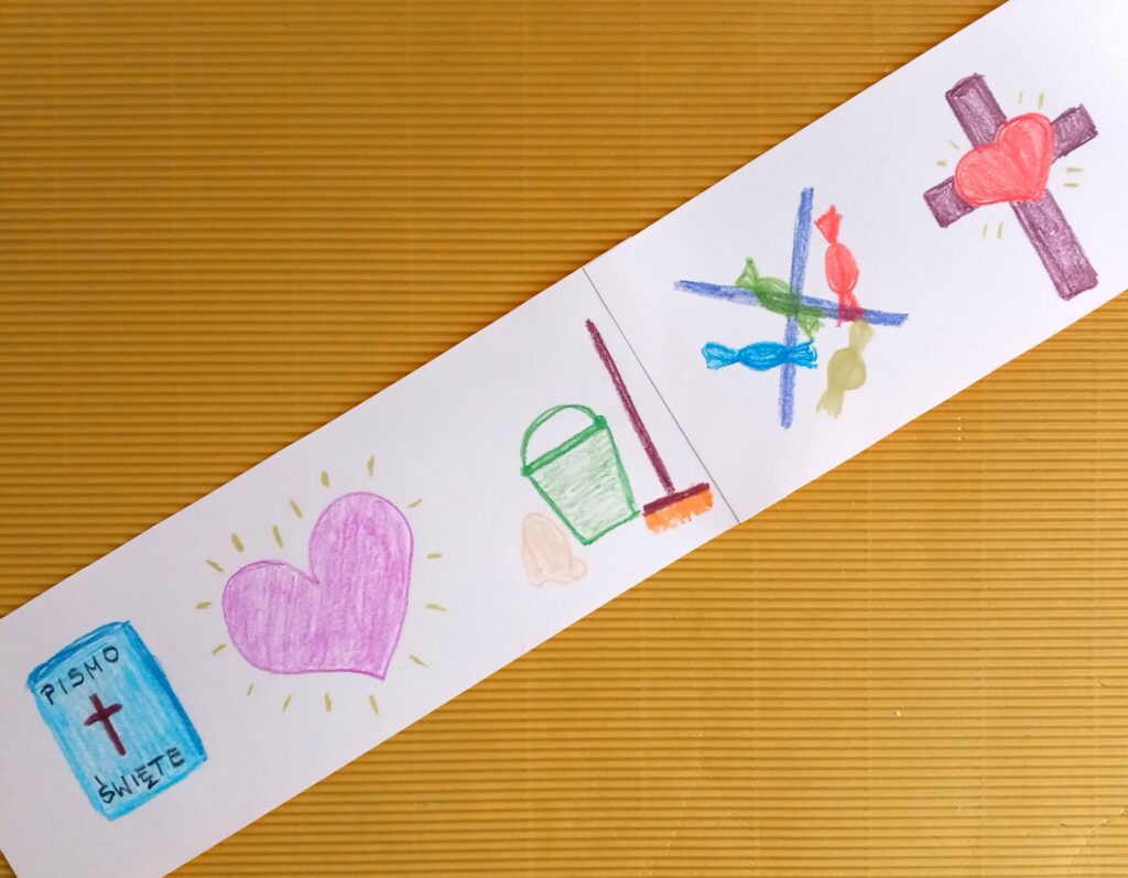 Kartkę z bloku technicznego przecinamy poziomo na pół. Następnie sklejamy jej brzegi, by powstał długi pasek papieru. Jedną ze stron paska ozdabiamy w dowolny sposób (można narysować serduszka, gwiazdki lub kwiatki). Na drugiej stronie papierowego paska rysujemy dobre uczynki, które możesz wykonać w czasie Wielkiego Postu; np. poczytam Pismo Święte, pomodlę się, posprzątam pokój, pójdę na nabożeństwo drogi krzyżowej, zrezygnuje z jedzenia słodyczy lub gry na telefonie. Teraz sklejamy brzegi kartki, by można było nasz kalejdoskop postawić na stole. Potem wycinamy z kolorowej kartki serduszko lub inną ozdobę i klejem na gorąco przyklejamy do klamerki. Teraz możesz klamerką zaznaczać, jaki dobry uczynek wykonasz konkretnego dnia. Powodzenia!