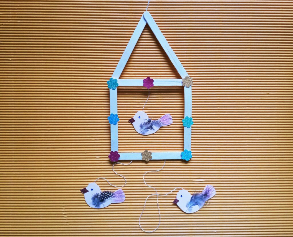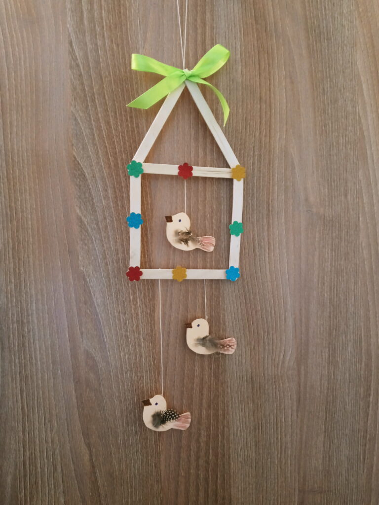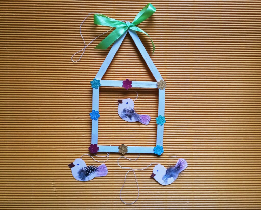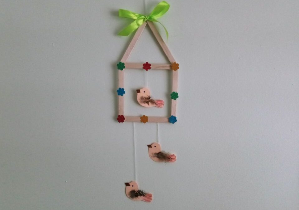 Z drewnianych patyczków do lodów układamy kwadrat i sklejamy. Gdy klej wyschnie układamy kolejne dwa patyczki w kształcie trójkątnego daszku i przyklejamy. Z kolorowego papieru wycinamy ozdoby (kwiatki lub motylki), a następnie przyklejamy do brzegów karmnika. Potem rysujemy na kartce z bloku technicznego kształty 3 ptaszków i wycinamy. Kredkami dorysowujemy ptaszkom oczy, dzióbek i ogonek, po czym przyklejamy piórka w miejscu skrzydeł. Ptaszki mocujemy do karmnika za pomocą sznurka i kleju umocowując je w odpowiedniej odległości. Później na szczycie daszku przyklejamy pętelkę ze sznurka oraz wstążeczkę. Nasza karmnik z ptaszkami jest już gotowy do powieszenia.