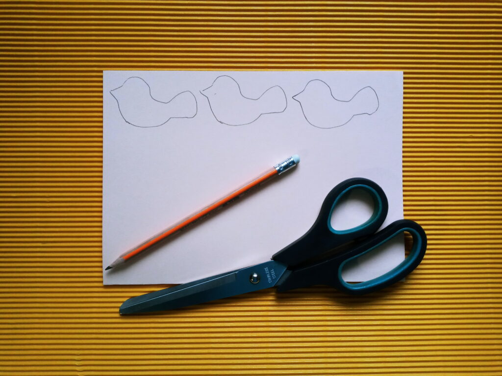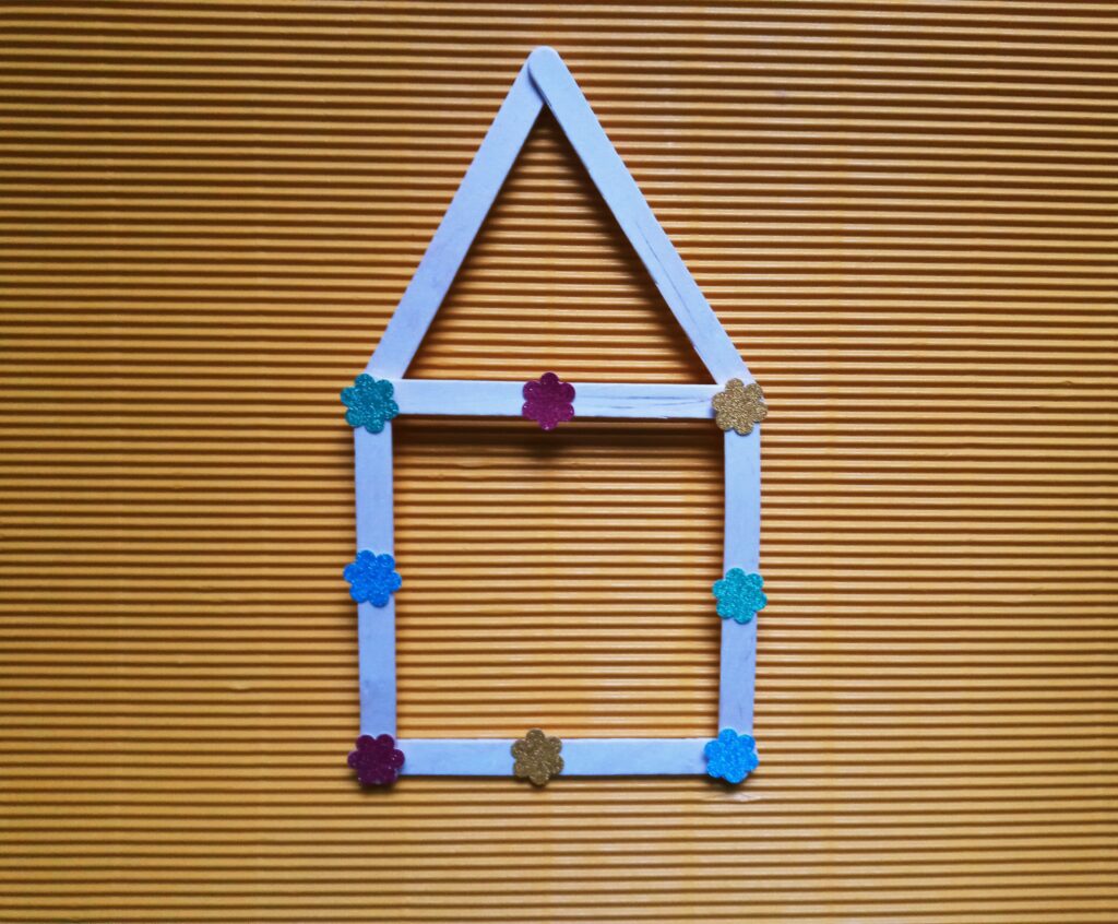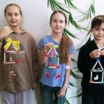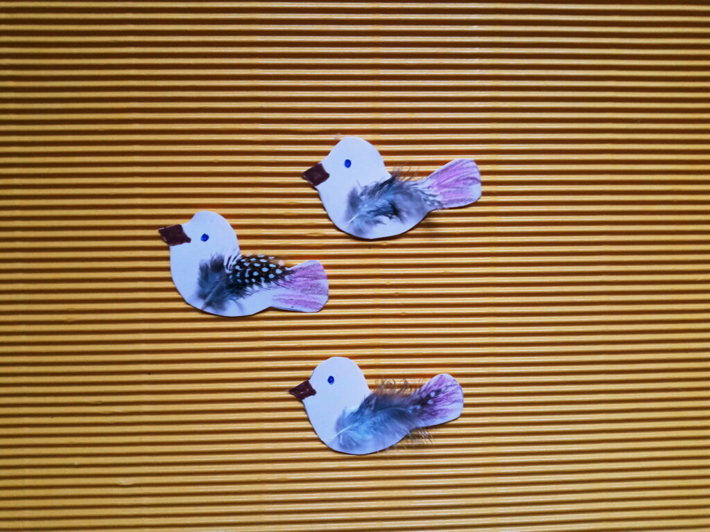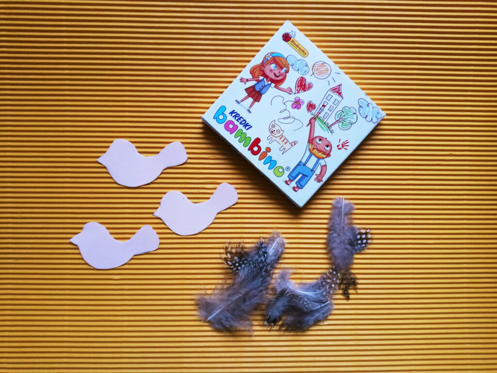 Z drewnianych patyczków do lodów układamy kwadrat i sklejamy. Gdy klej wyschnie układamy kolejne dwa patyczki w kształcie trójkątnego daszku i przyklejamy. Z kolorowego papieru wycinamy ozdoby (kwiatki lub motylki), a następnie przyklejamy do brzegów karmnika. Potem rysujemy na kartce z bloku technicznego kształty 3 ptaszków i wycinamy. Kredkami dorysowujemy ptaszkom oczy, dzióbek i ogonek, po czym przyklejamy piórka w miejscu skrzydeł. Ptaszki mocujemy do karmnika za pomocą sznurka i kleju umocowując je w odpowiedniej odległości. Później na szczycie daszku przyklejamy pętelkę ze sznurka oraz wstążeczkę. Nasza karmnik z ptaszkami jest już gotowy do powieszenia.