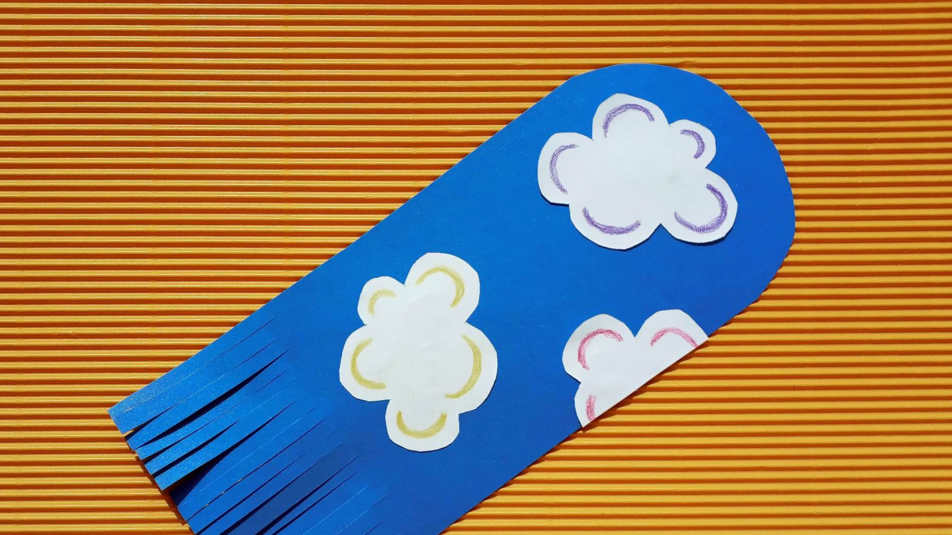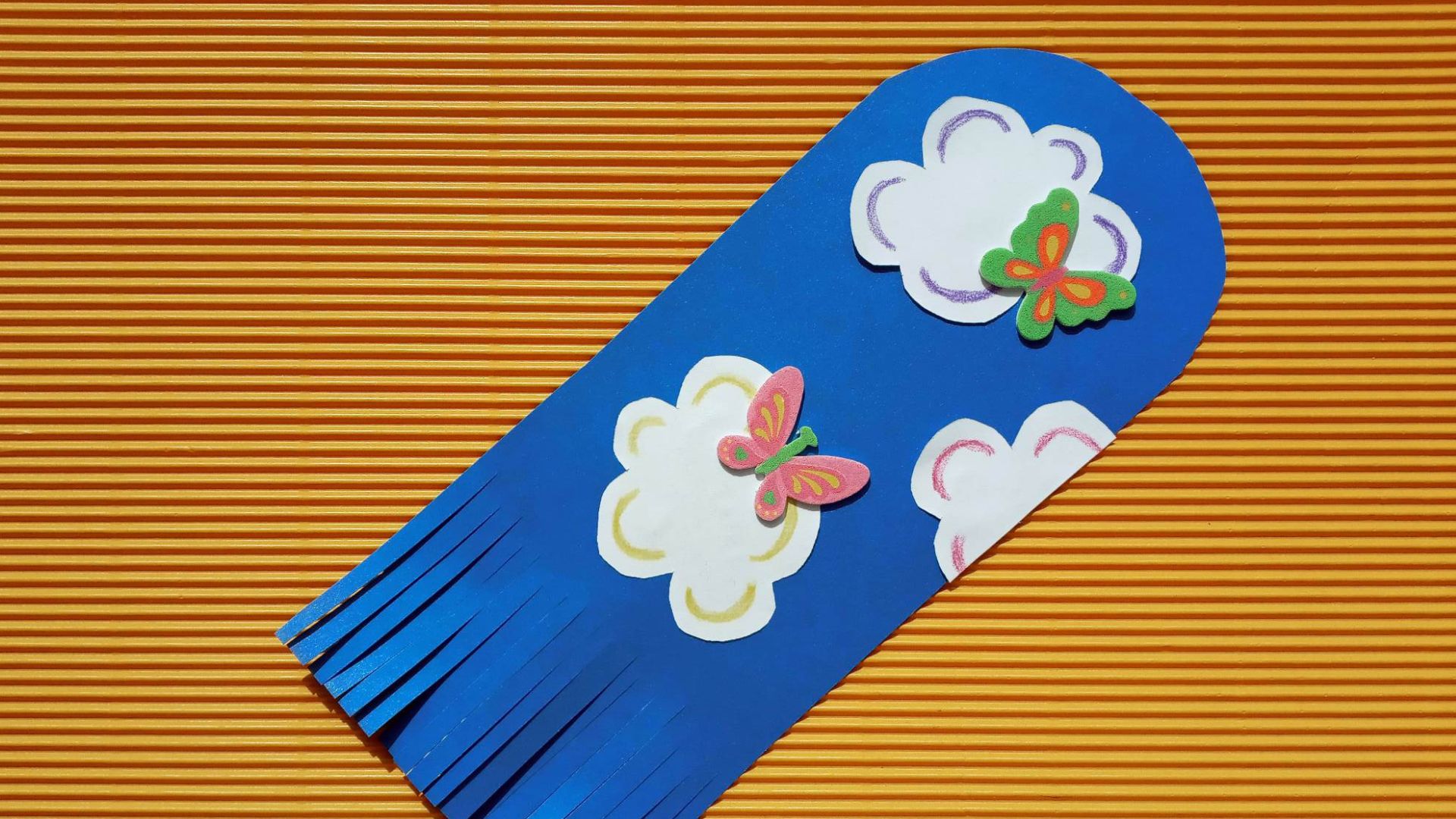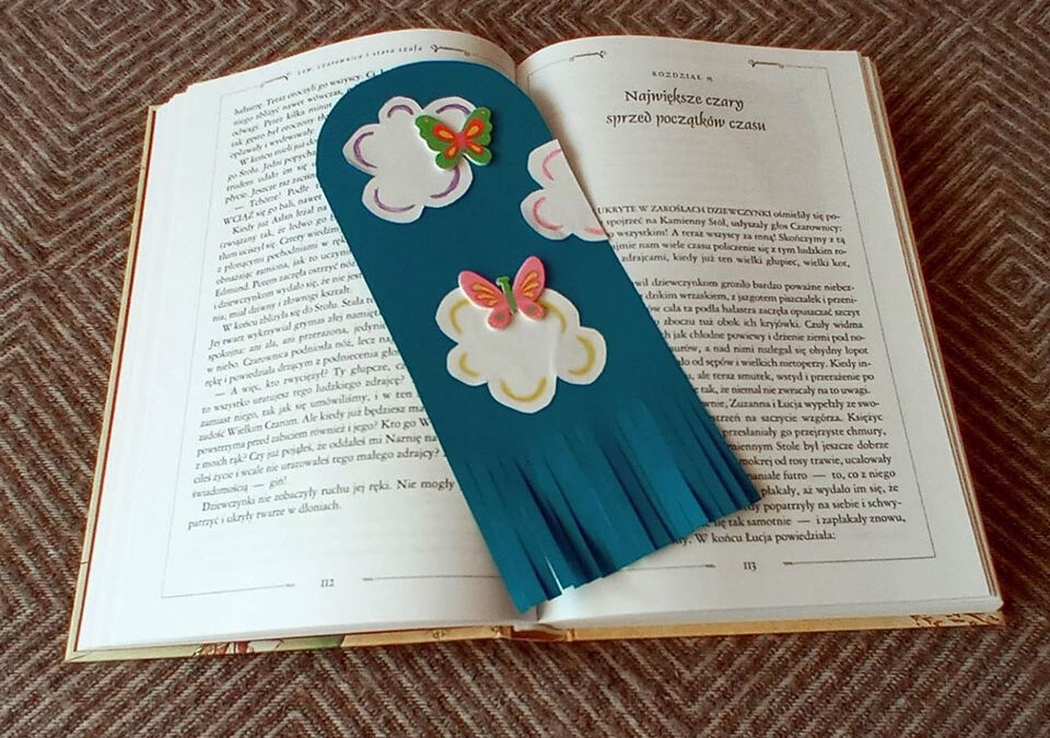 Niebieską kartkę z jednej strony zaokrąglamy nożyczkami, a z drugiej nacinamy, by powstała postrzępiona końcówka zakładki. Z białej kartki wycinamy kilka chmurek. Brzegi chmurek kolorujemy kredkami lub flamastrami. Przyklejamy chmurki do zakładki z jednej i drugiej strony. Można jeszcze nakleić lub narysować motylki. Zakładka gotowa!