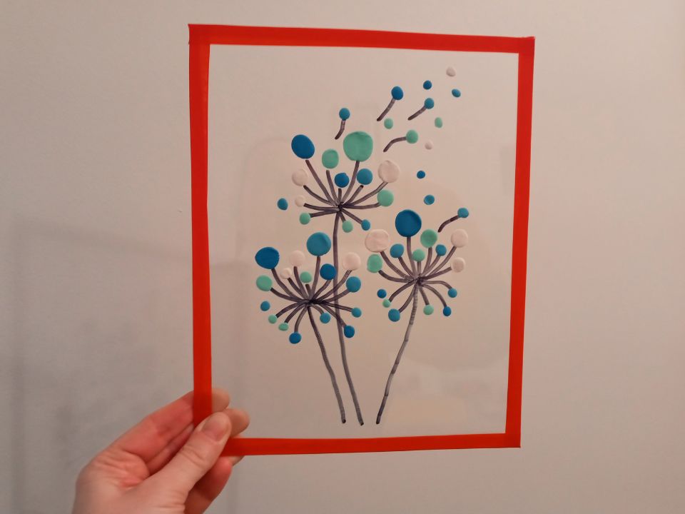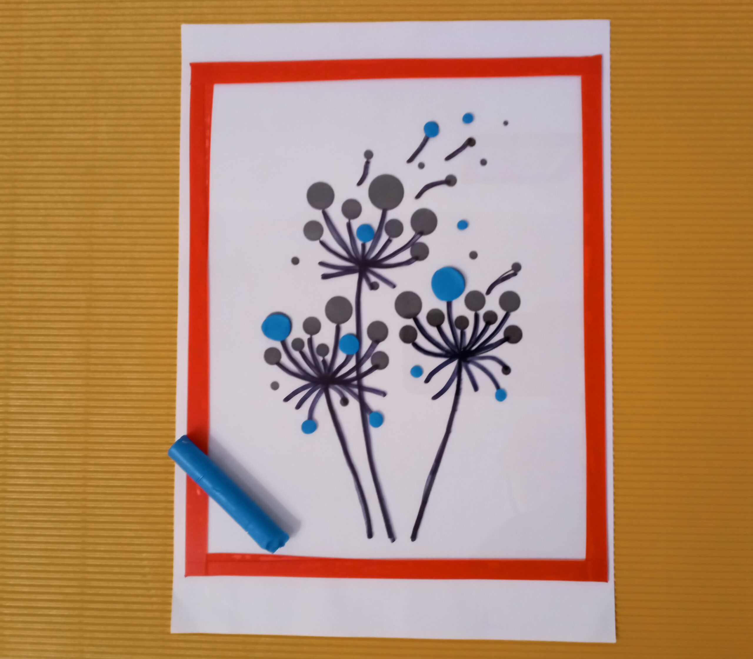 Szkło wyczyść, by nie było na nim smug i zacieków. Następnie oklej brzegi szklanej powierzchni taśmą izolacyjną, by się nie pokaleczyć. Taśma będzie jednocześnie ozdobną ramką. Teraz przy pomocy czarnego flamastra samodzielnie narysuj łodygę i koszyczki dmuchawca. Możesz również skorzystać z wydruku komputerowego, który można podłożyć pod szkło i markerem odwzorować po linii. Następnie uformuj z plasteliny malutkie kuleczki i przyklej do szkła. W ten sposób powstaną kolorowe nasionka dmuchawca.