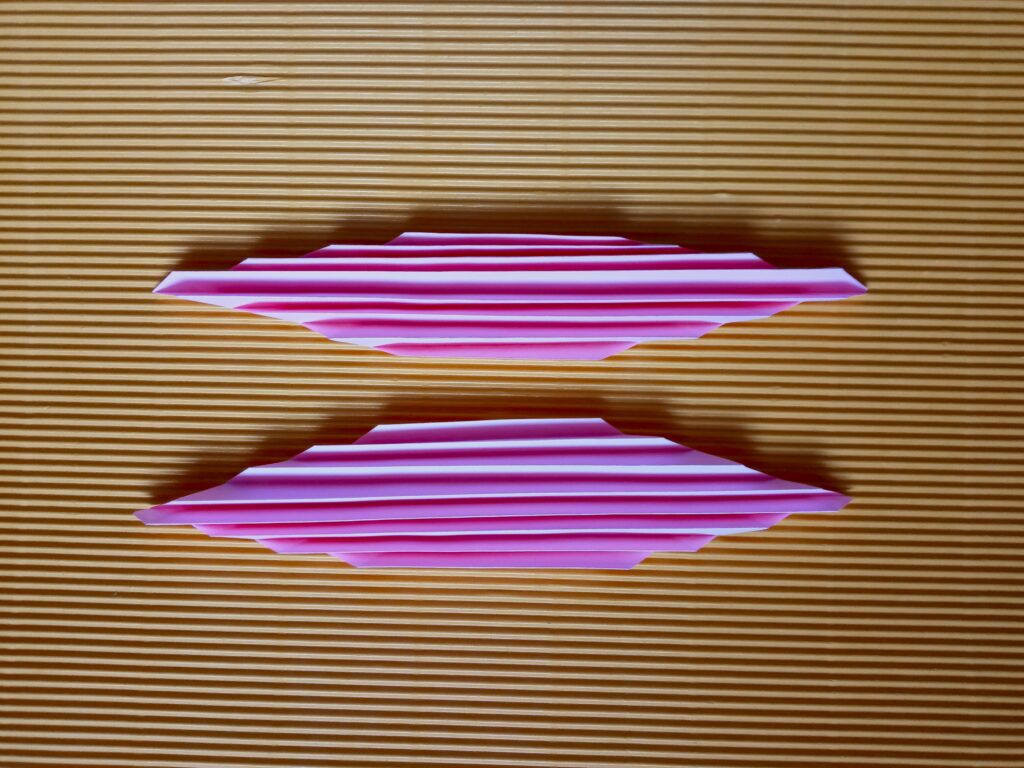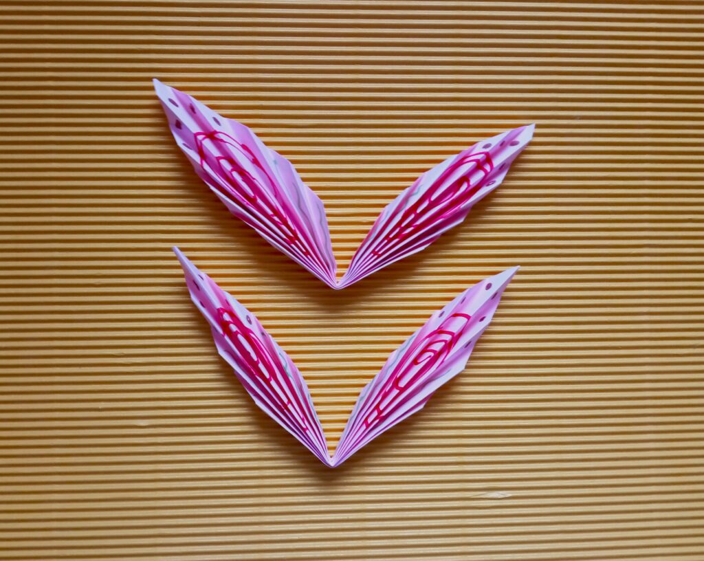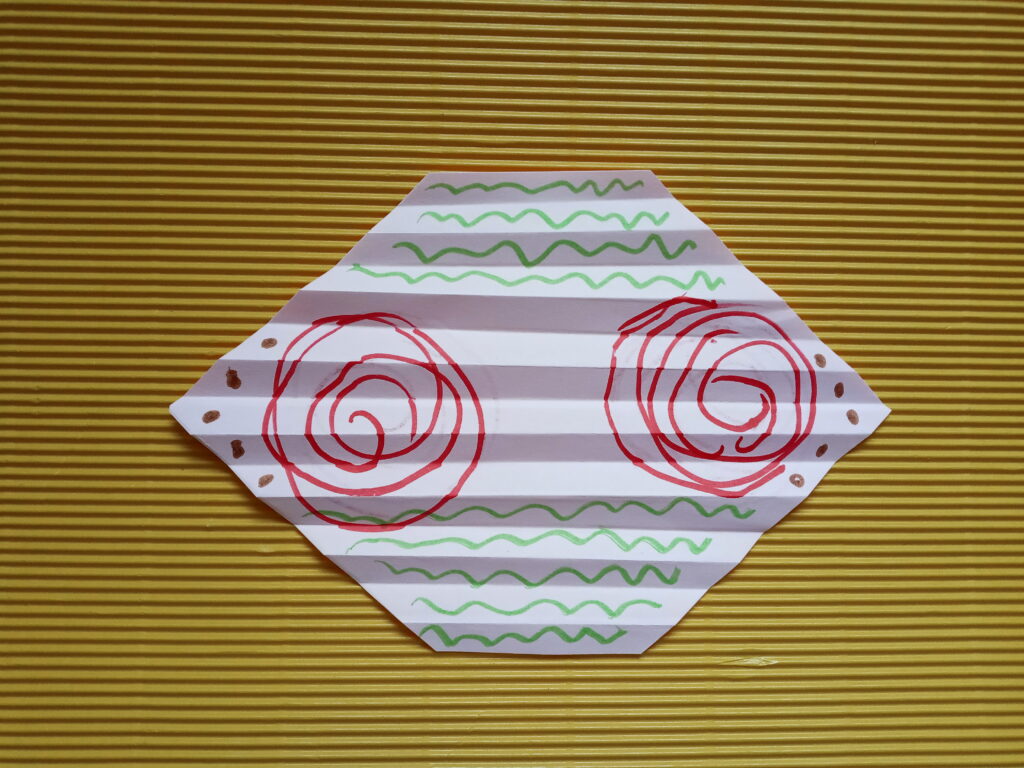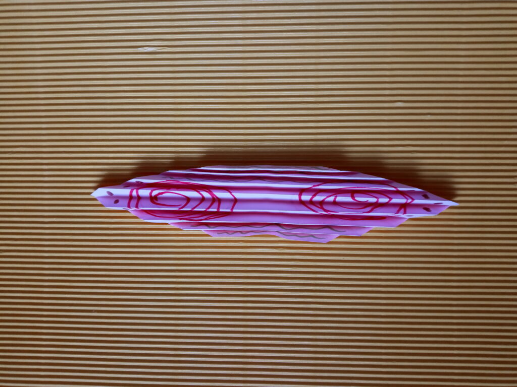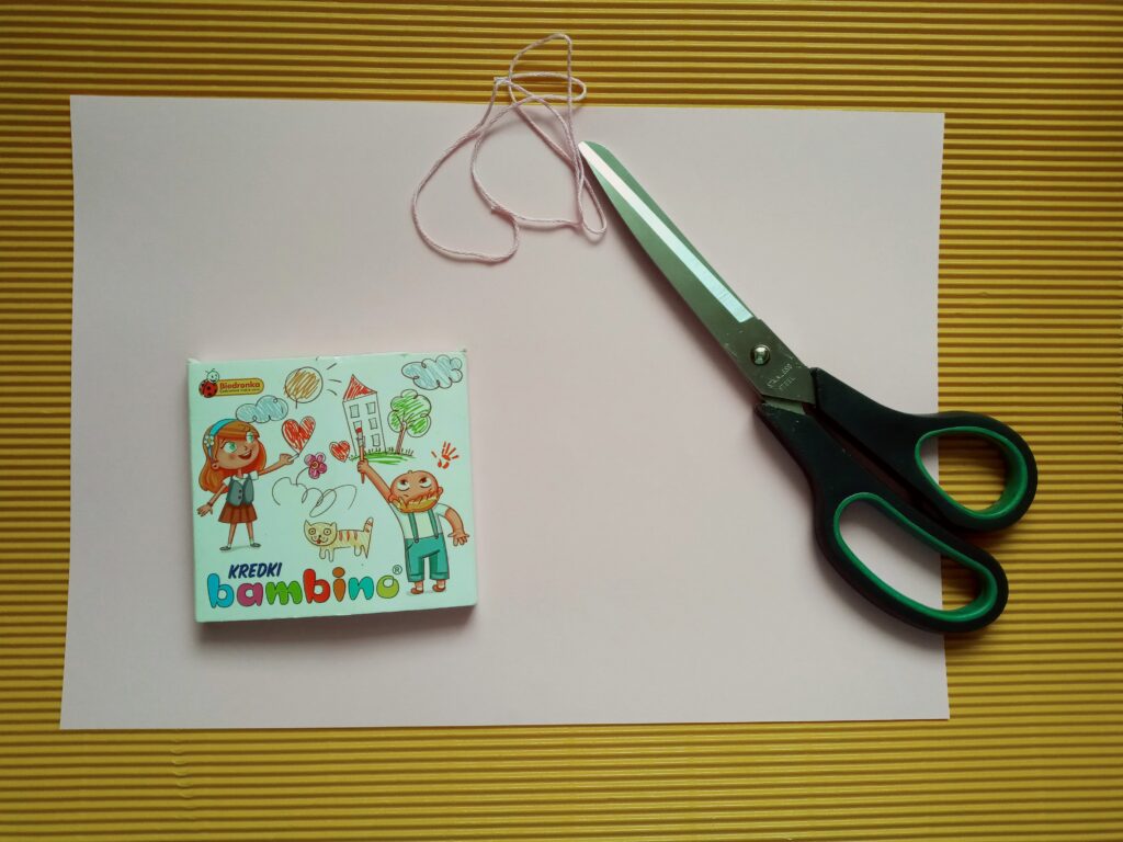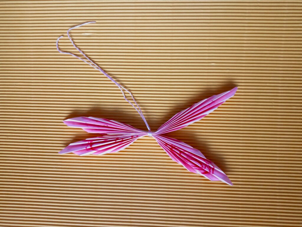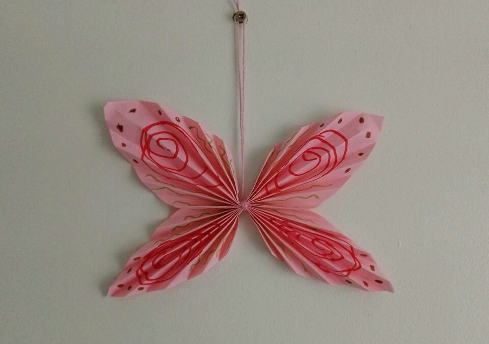 Kartkę z bloku przecinamy na pół. Następnie zginamy kartki poziomo i zaginamy rogi do środka z obydwu stron. Teraz nożyczkami ścinamy trójkąty, które powstały po zagięciu kartki. Powstałe arkusze składamy w harmonijkę o szerokości około 0,5 centymetra. Rozkładamy harmonijki i kredkami rysujemy wzory na papierze, które będą za chwilę skrzydłami motyla. Pokolorowane kartki ponownie składamy w harmonijkę i zginamy w połowie, po czym zawiązujemy w miejscu zgięcia sznurkiem lub nitką. Warto wziąć dłuższy kawałek sznurka, by zrobić z niego dodatkowo pętelkę, na której powiesimy motyla. Następnie delikatnie formujemy skrzydła i nasz kolorowy owad jest już gotowy.