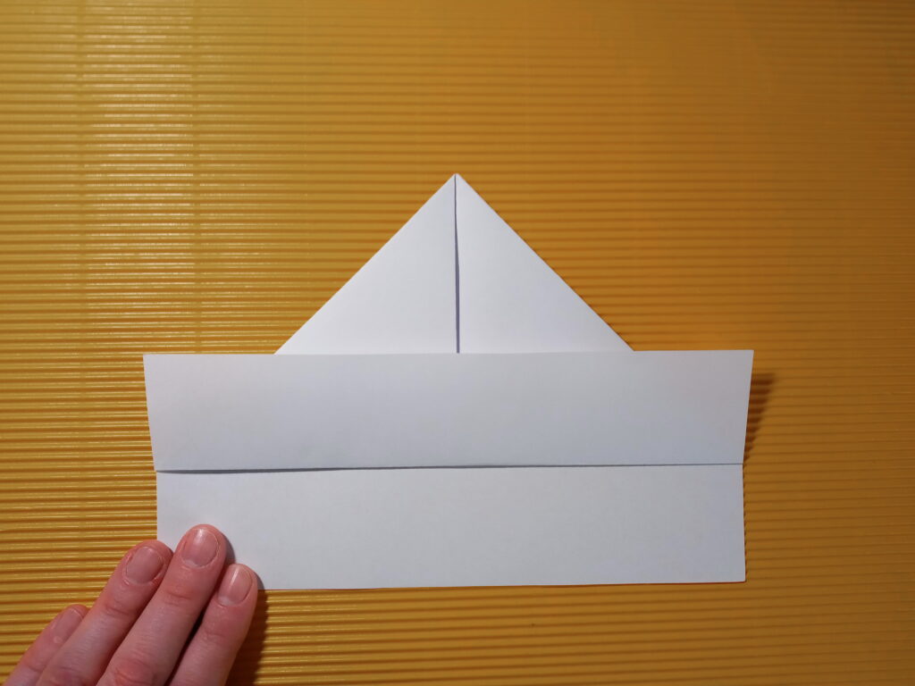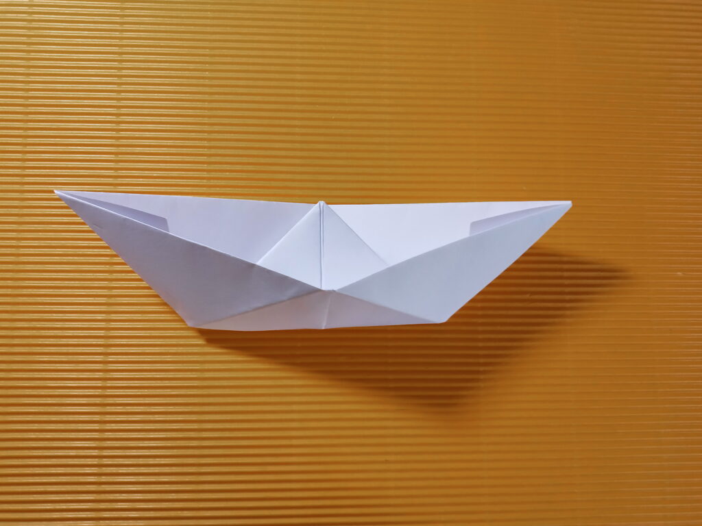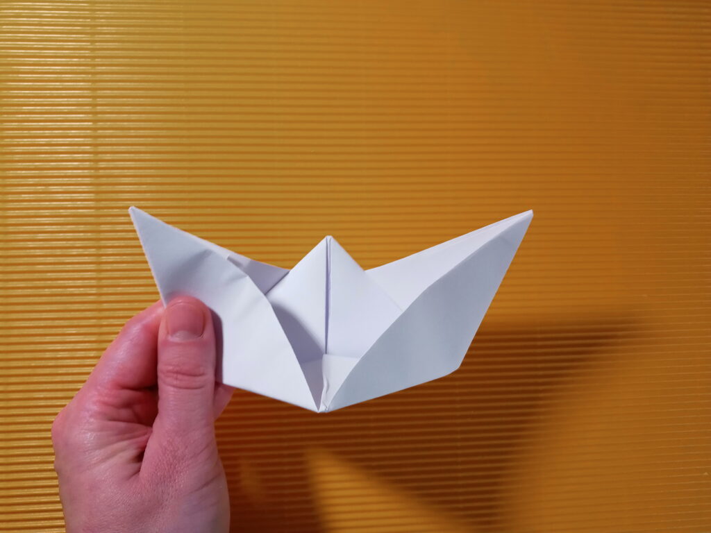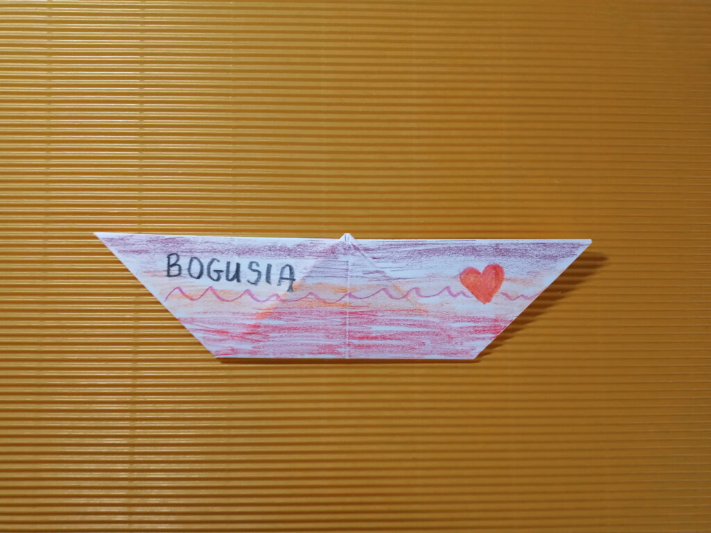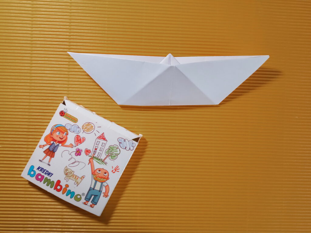 Kartkę z bloku rysunkowego składamy na połowę. Następnie górne rogi zaginamy do środka. Dolny pasek, który nam został wyginamy do góry z jednej i drugiej strony. Wystające różki zaginamy do ośrodka z obu stron. Potem chwytamy kartkę na zgięciu i obracając wyginamy, by powstał nam romb. Wierzchołek rombu zginamy do góry z jednej i drugiej strony. Ponownie chwytamy kartkę na zgięciu i obracając wyginamy, by powstał nam kwadrat. Teraz naciągamy konstrukcje od góry za dwa boki i w ten sposób powstanie nam łódka.