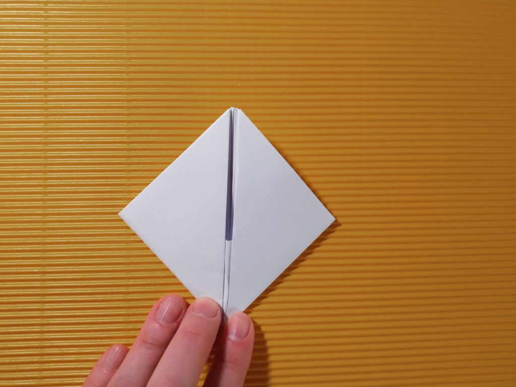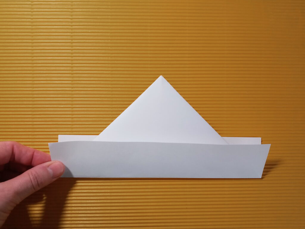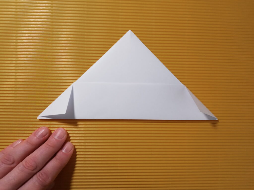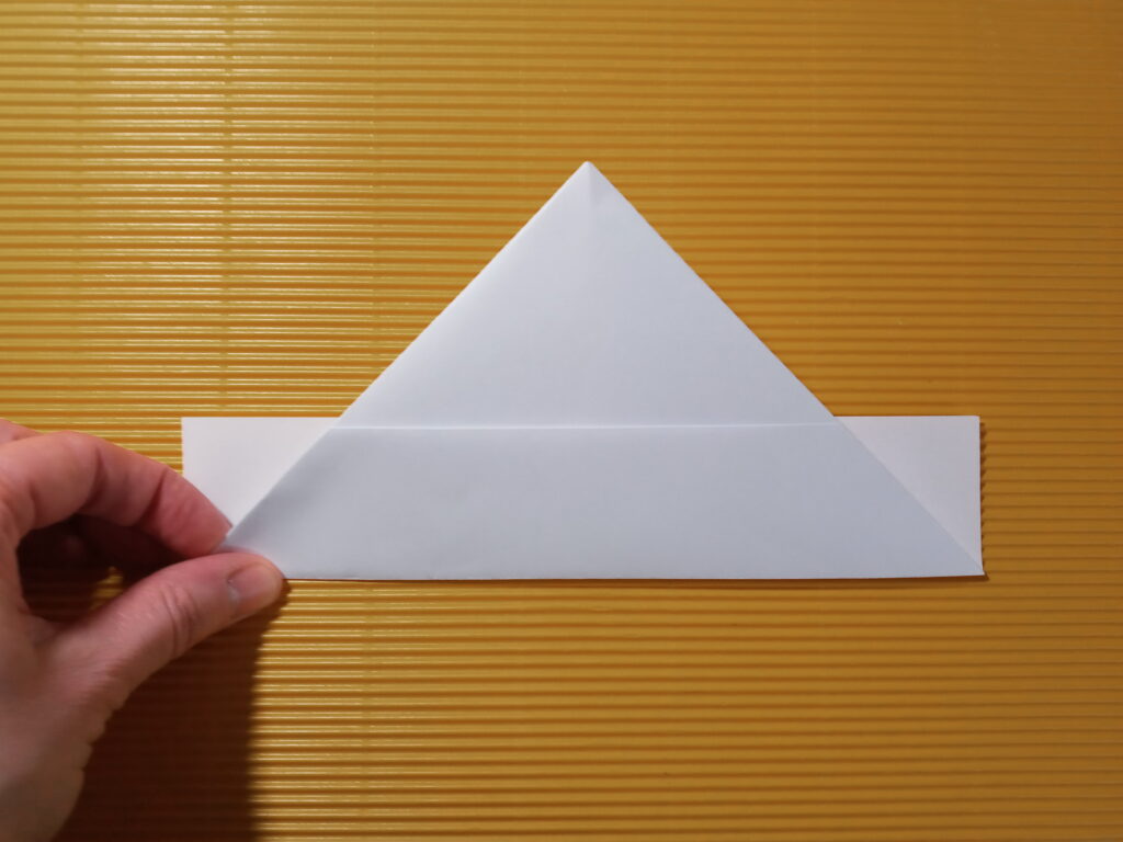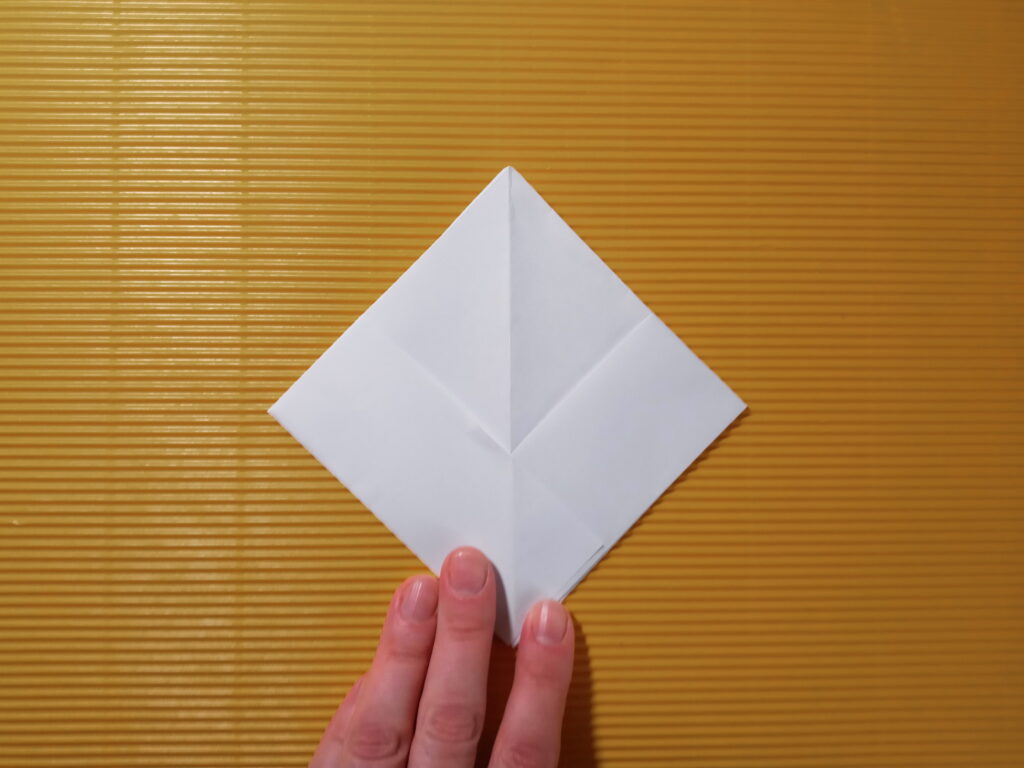Kartkę z bloku rysunkowego składamy na połowę. Następnie górne rogi zaginamy do środka. Dolny pasek, który nam został wyginamy do góry z jednej i drugiej strony. Wystające różki zaginamy do ośrodka z obu stron. Potem chwytamy kartkę na zgięciu i obracając wyginamy, by powstał nam romb. Wierzchołek rombu zginamy do góry z jednej i drugiej strony. Ponownie chwytamy kartkę na zgięciu i obracając wyginamy, by powstał nam kwadrat. Teraz naciągamy konstrukcje od góry za dwa boki i w ten sposób powstanie nam łódka.