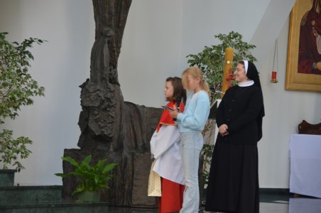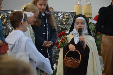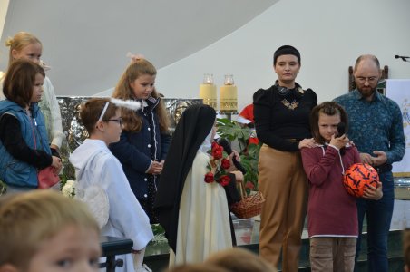 2024-10-29We wspomnienie świętej Teresy od Dzieciątka Jezus dzieci z Koła Misyjnego przy parafii Matki Bożej Królowej Polski w Toruniu wraz z rodzicami przygotowały krótką inscenizację o Małej Świętej. A dokładniej o problemach współczesnego człowieka i pomocy, jaką może mu udzielić święta Teresa od Dzieciątka Jezus. Przedstawienie udało się na „brawo” i sprowokowało do myślenia zarówno dzieci, jak i ich rodziców. Autorem inscenizacji jest s. Bogumiła Ptasińska CST, która w bardzo prosty sposób ukazała do kogo i w jaki sposób warto się zwracać w trudnościach. Młodzi aktorzy czekają na kolejne małe sztuki.