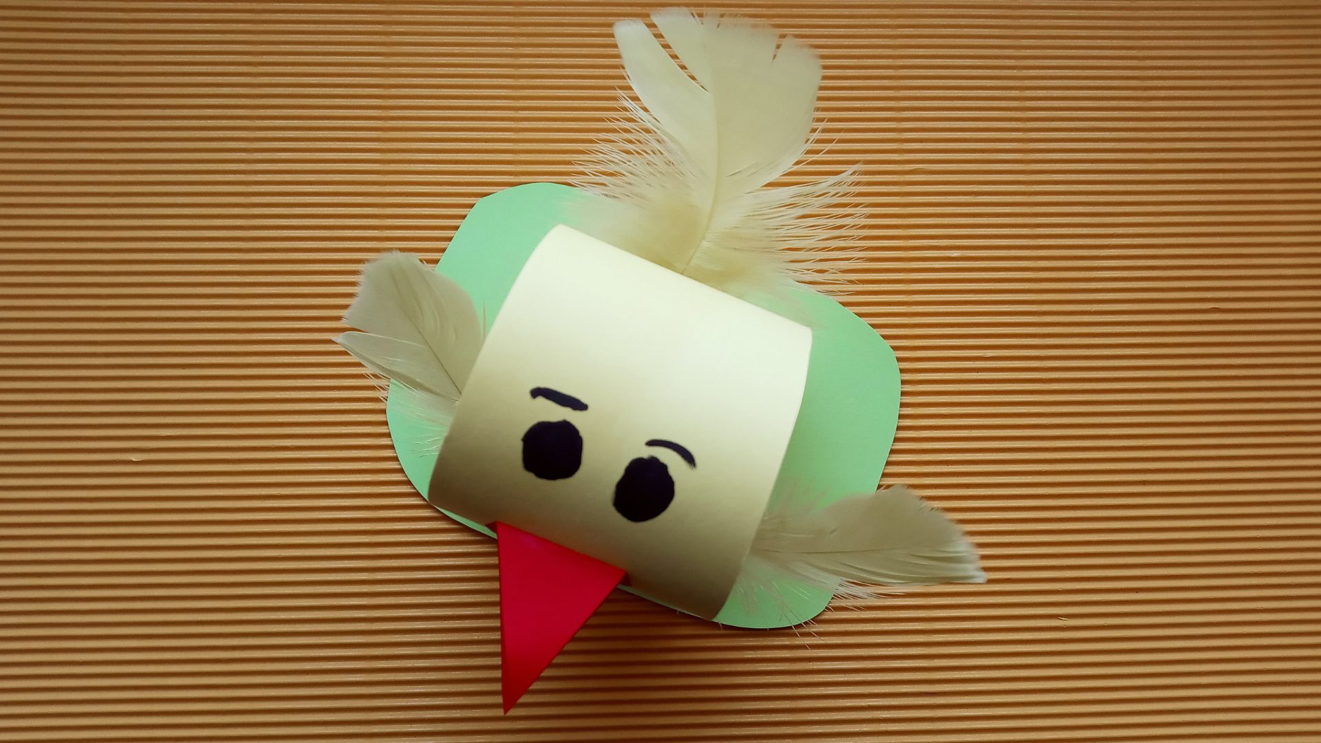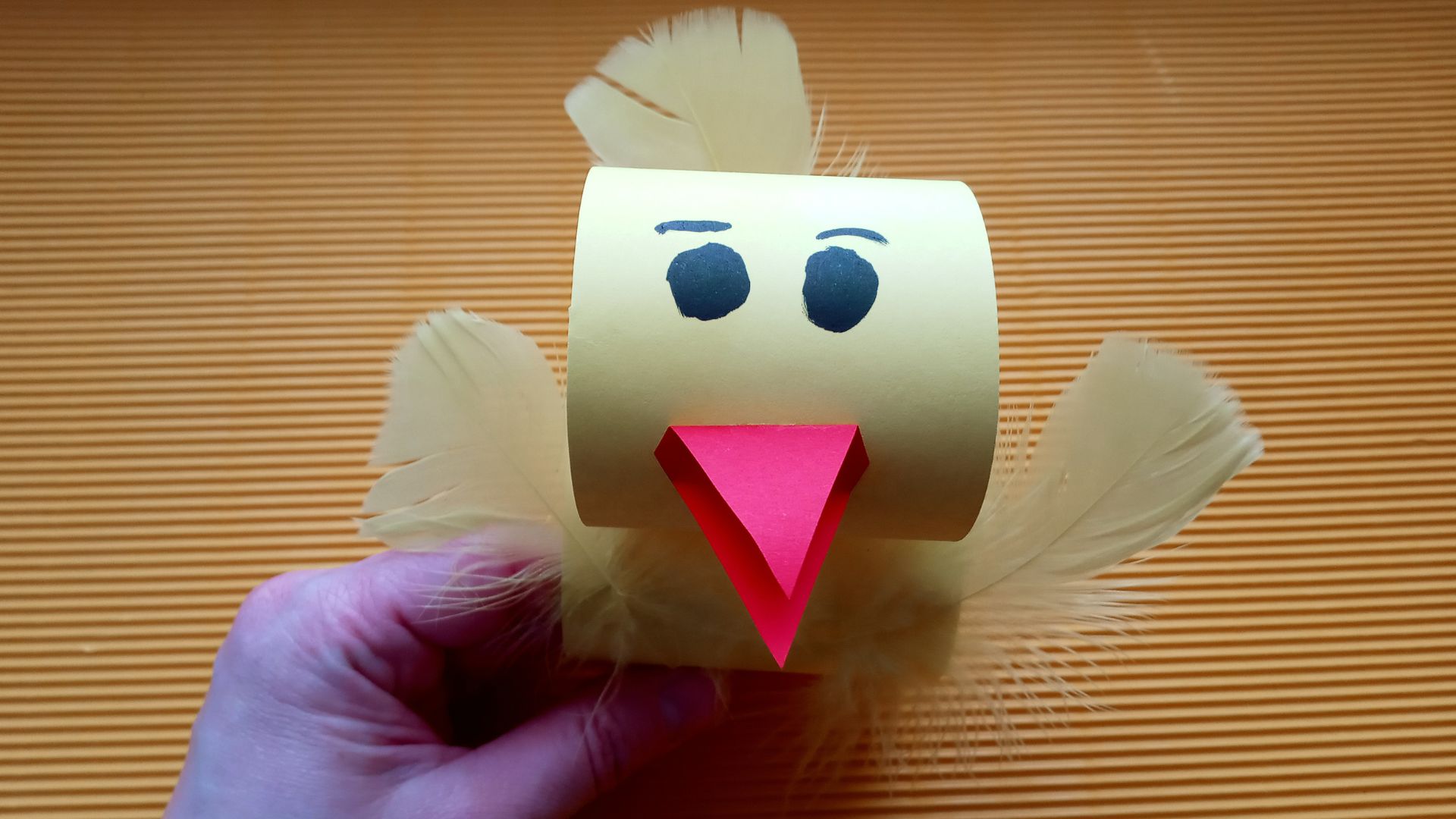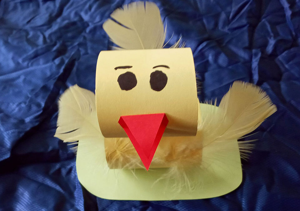 Z żółtego brystolu wycinamy dwa paski papieru o wymiarach 20/7cm i 20/5cm. Każdy pasek papieru sklejamy, by powstały dwie żółte rolki. Następnie sklejamy je razem. W ten sposób uzyskamy brzuszek i głowę kurczaczka. Później wycinamy z kawałka czerwonego papieru dziób i przyklejamy. Czarnym flamastrem rysujemy oczy (można również przykleić gotowe oczy z plastiku). Potem przyklejamy piórka, by nasz kurczaczek miał skrzydełka i ogonek. Na samym końcu wycinamy z zielonego papieru zaokrąglony kwadrat mniej więcej o wymiarach 10/15 cm i przyklejamy do niego kurczaczka. Wszystko gotowe!