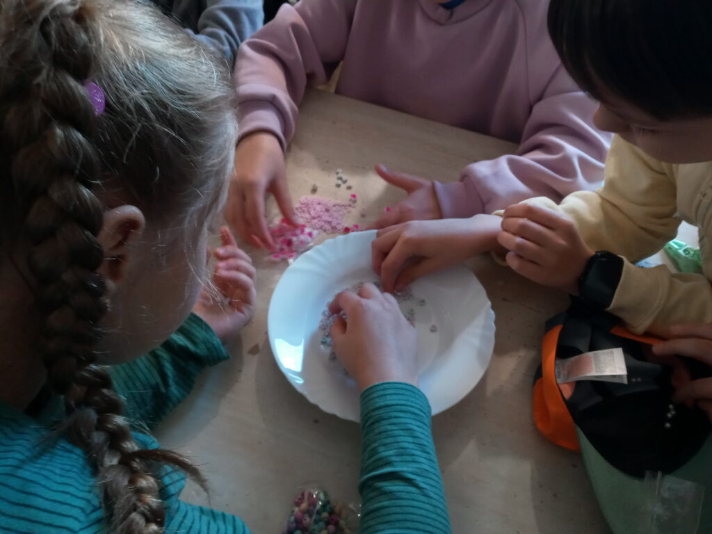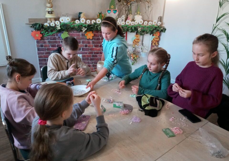 W części warsztatowej dzieci wykonały z koralików bransoletki na rękę, a także ozdobne zawieszki do telefonów komórkowych. Podczas pracy trzeba było naprawdę uważać, by nie rozsypać koralików.