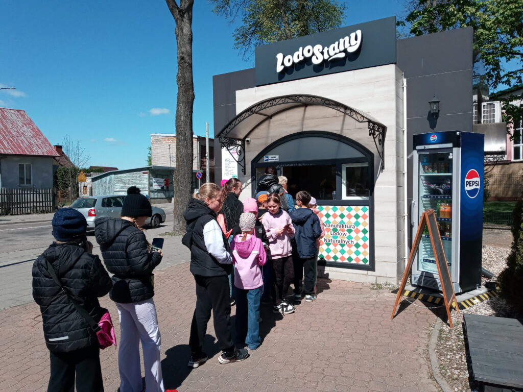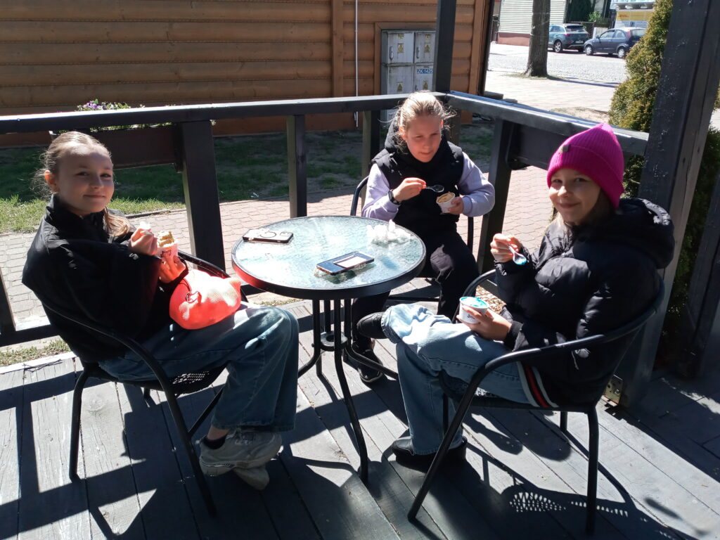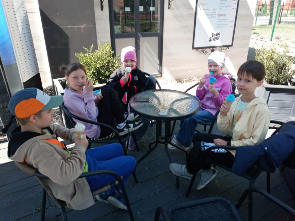 Na zakończenie spotkania udaliśmy się na lody do pobliskiej kawiarenki. Po drodze spotkaliśmy właściciela lodziarni, który ufundował dzieciom lody i gofry na swój koszt. Chłopcy i dziewczynki byli zachwyceni darmowymi słodyczami.