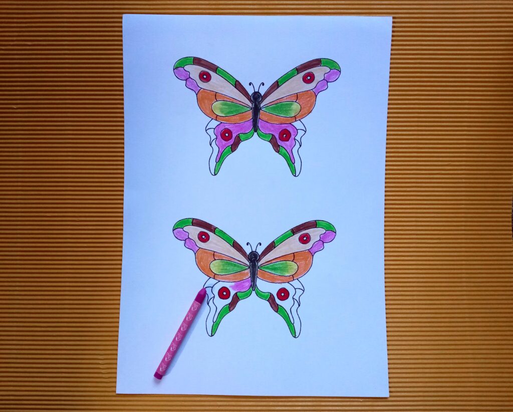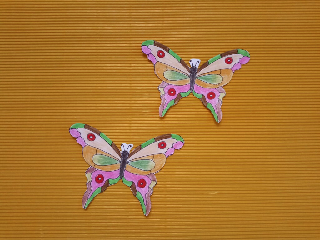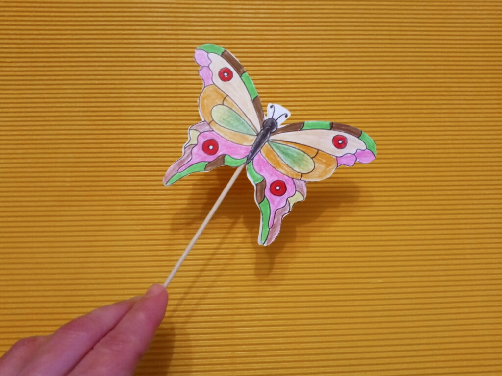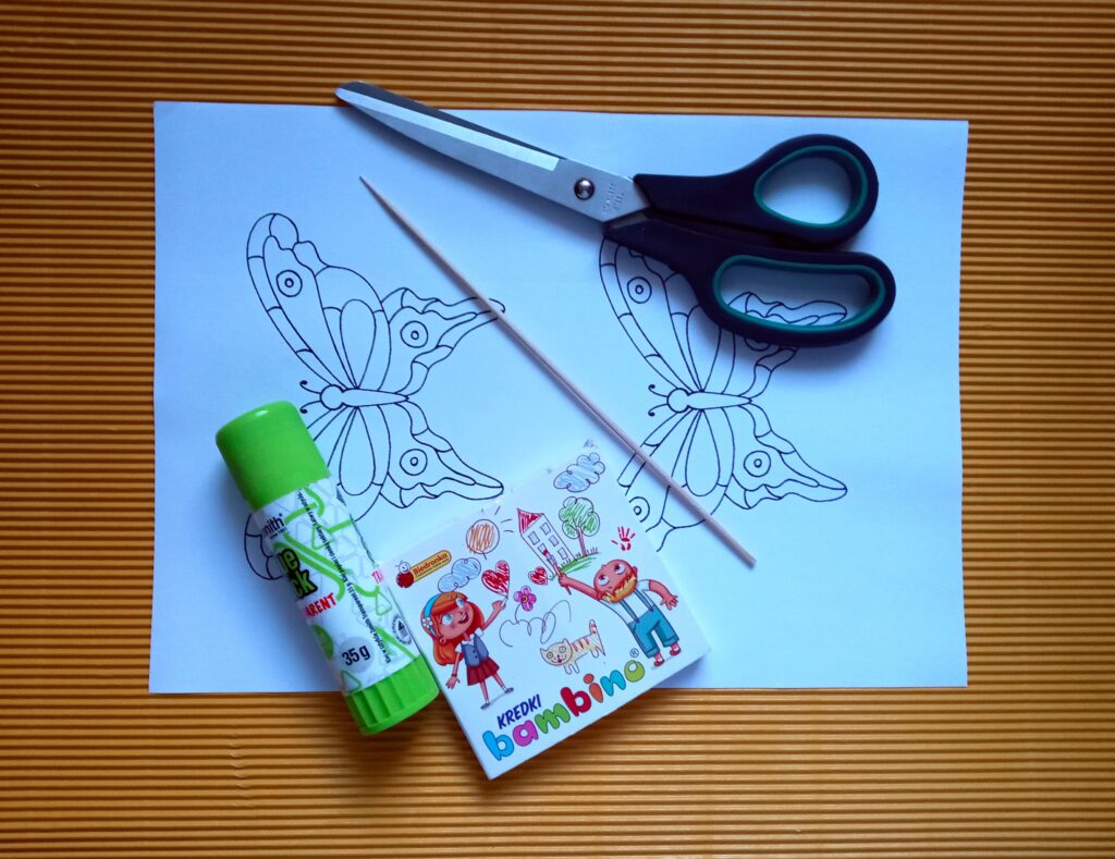 Na kartce wydrukuj lub naszkicuj ołówkiem obrazek motyla. Skopiuj grafikę, by mieć dwa identyczne obrazki. Następnie pokoloruj obrazki, by wyglądały tak samo. Wytnij motyle nożyczkami. Jeden z obrazków odwróć i posmaruj klejem. Przyłóż na środku patyczek (najlepszy będzie patyczek do szaszłyków), a potem przyklej drugiego motyla. Sprawdź, czy rysunki są równo sklejone. Poczekaj, aż klej dobrze wyschnie i umieść motylka w wybranym przez siebie miejscu. Kolorowy motyl na pewno przywoła uśmiech na twarzy każdej osoby, która na niego spojrzy.
