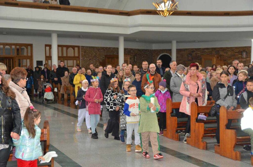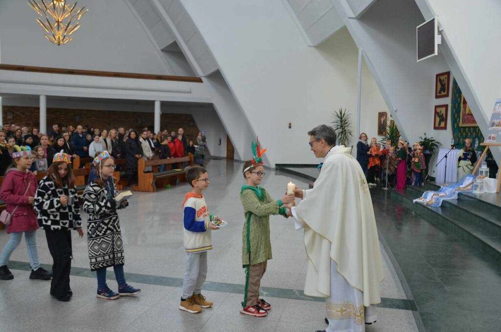 Podczas procesji z darami dzieci niosły zapaloną świecę, Biblię i różaniec misyjny.