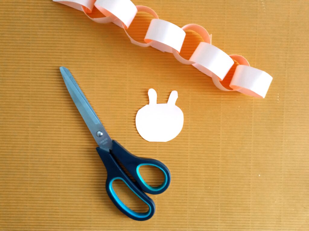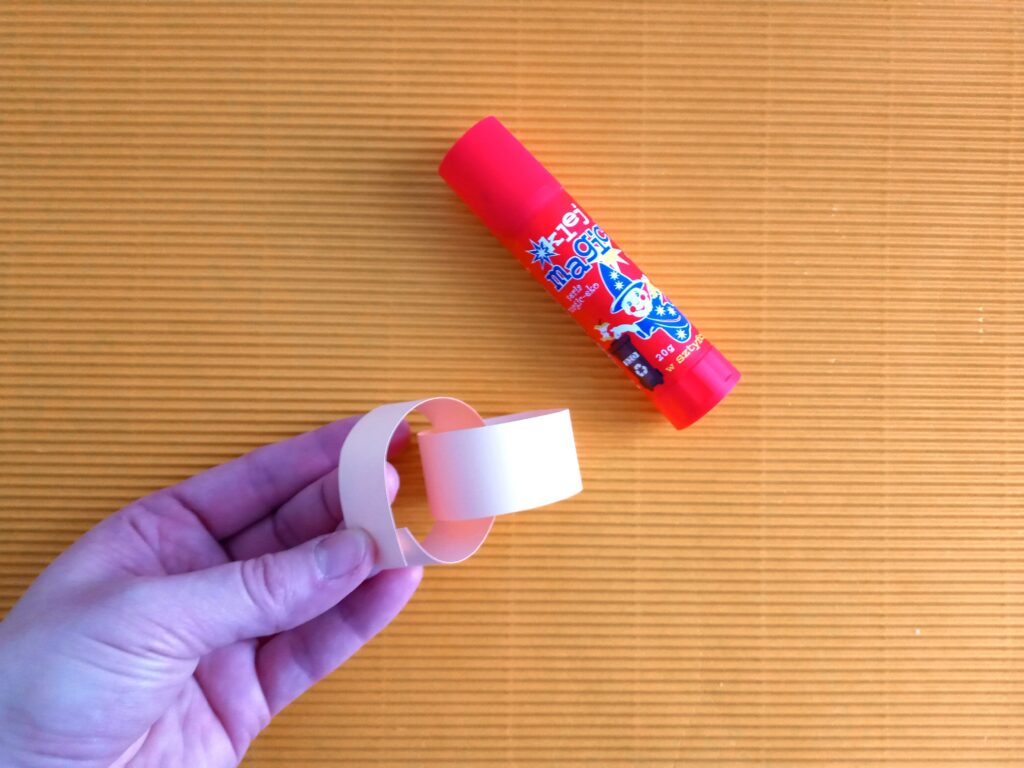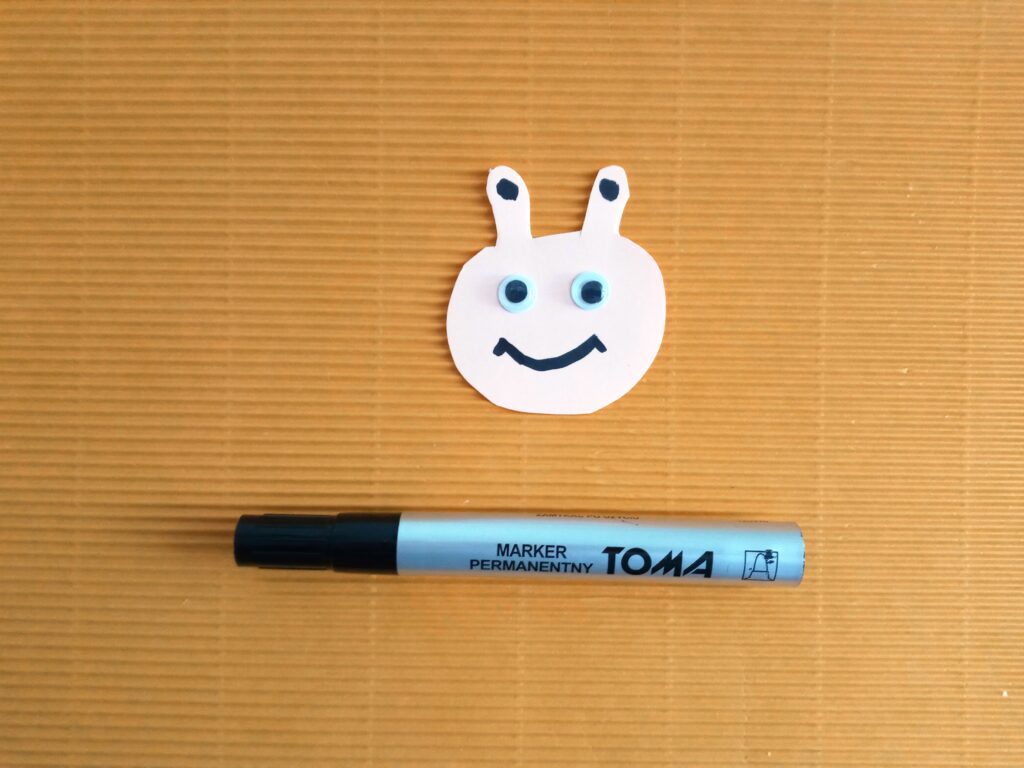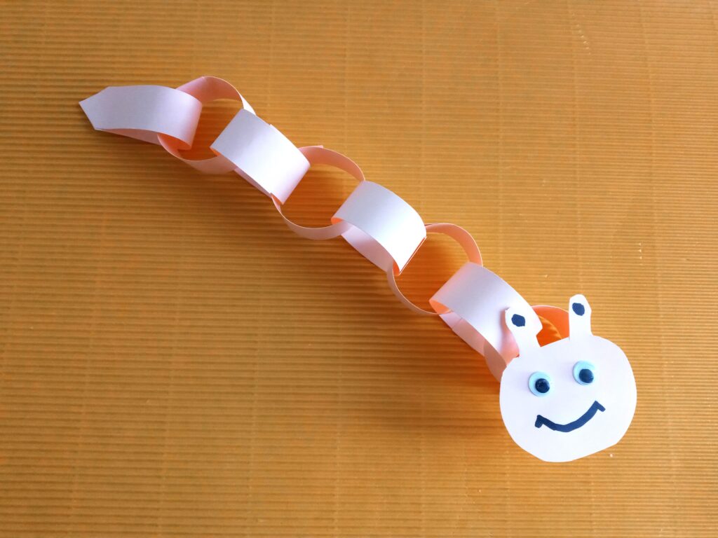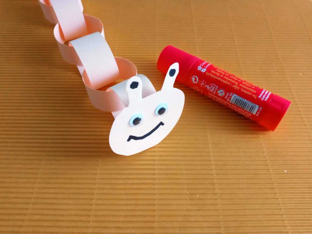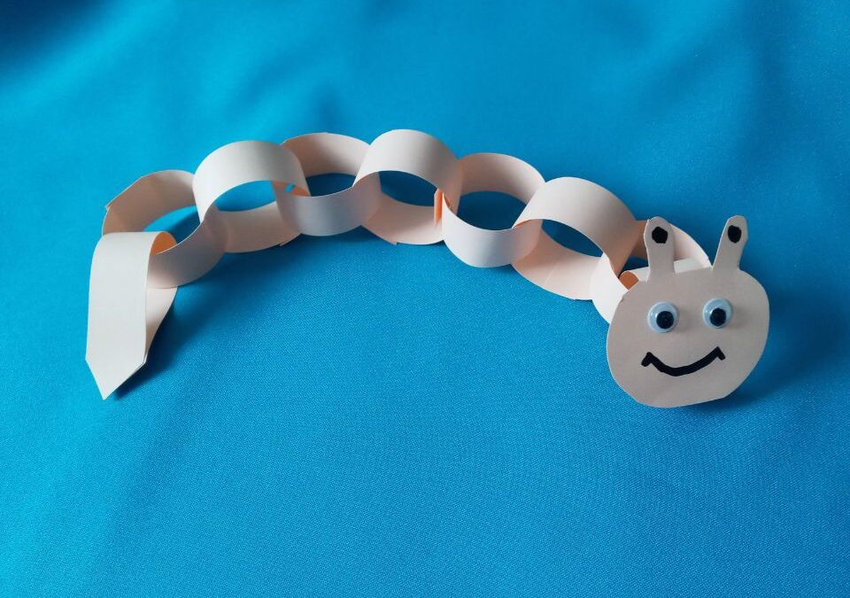 Kartkę z bloku technicznego przecinamy na pół. Następnie z połowy kartki wycinamy paski o szerokości ok. 2 cm. Końce jednego papierowego paska sklejamy, tak aby powstało kółeczko. Następny pasek przekładamy przez kółeczko i znowu sklejamy. Powstanie nam papierowy łańcuszek. Ostatni pasek sklejamy inaczej – końce łączymy razem, by powstał nam ogonek robaczka. Z drugiej połowy kartki wycinamy głowę z czułkami. Dorysowujemy oczy i usta flamastrem, a następnie przyklejamy głowę do papierowego łańcucha. Papierowy robaczek jest już gotowy!