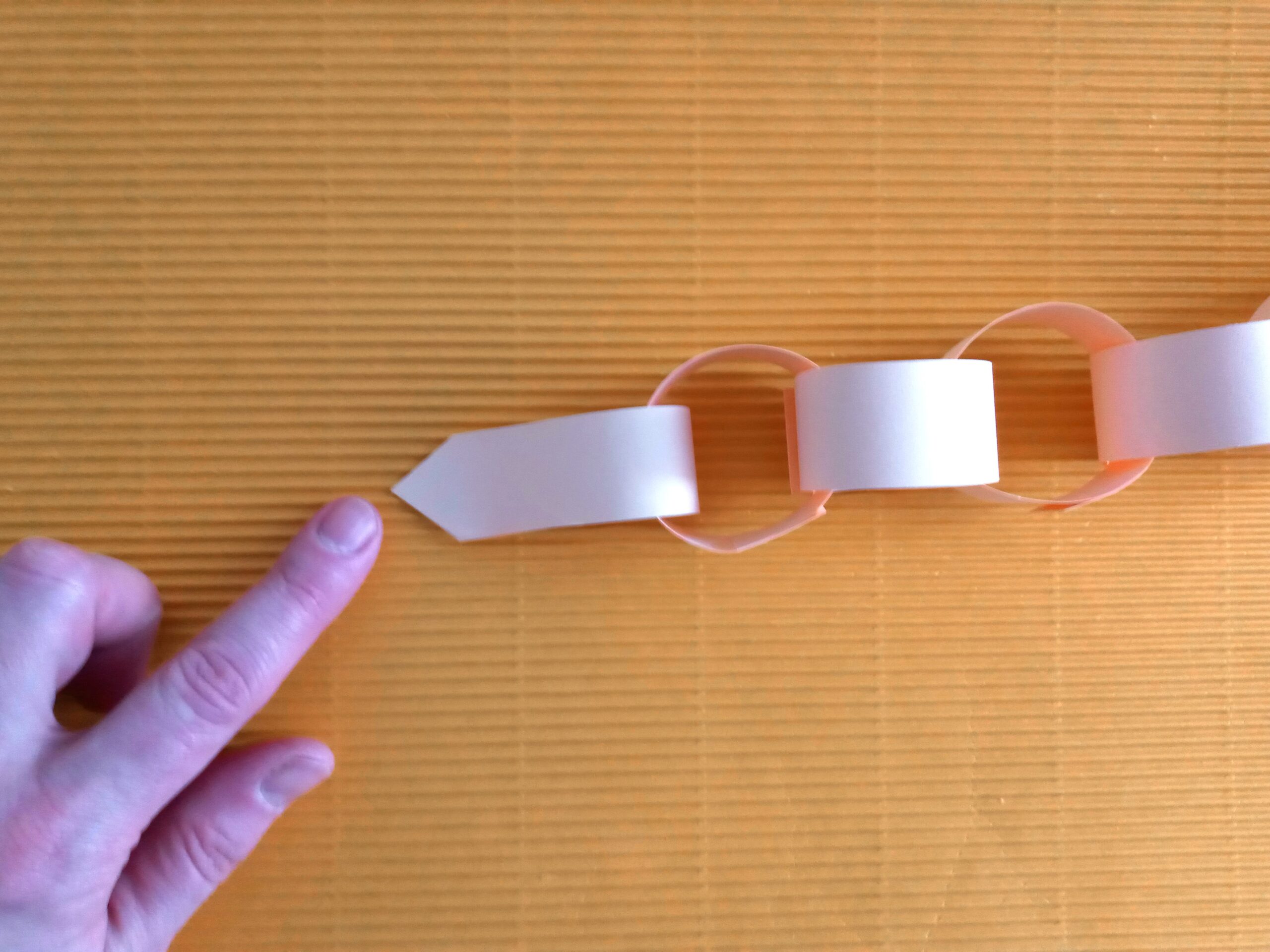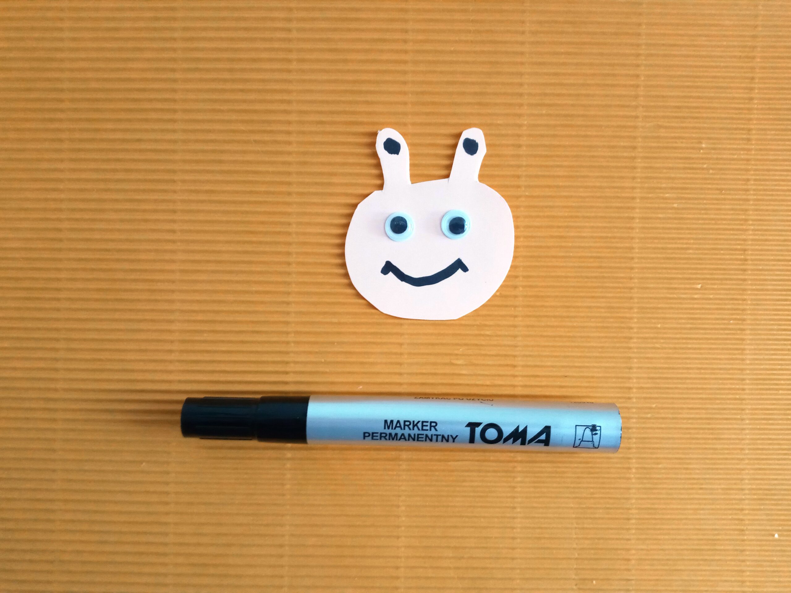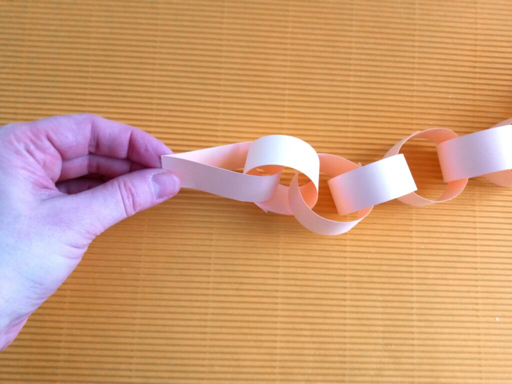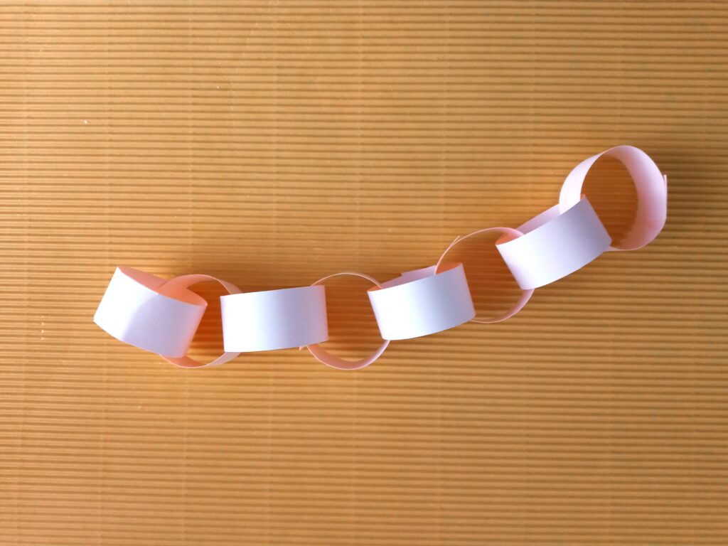Kartkę z bloku technicznego przecinamy na pół. Następnie z połowy kartki wycinamy paski o szerokości ok. 2 cm. Końce jednego papierowego paska sklejamy, tak aby powstało kółeczko. Następny pasek przekładamy przez kółeczko i znowu sklejamy. Powstanie nam papierowy łańcuszek. Ostatni pasek sklejamy inaczej – końce łączymy razem, by powstał nam ogonek robaczka. Z drugiej połowy kartki wycinamy głowę z czułkami. Dorysowujemy oczy i usta flamastrem, a następnie przyklejamy głowę do papierowego łańcucha. Papierowy robaczek jest już gotowy!