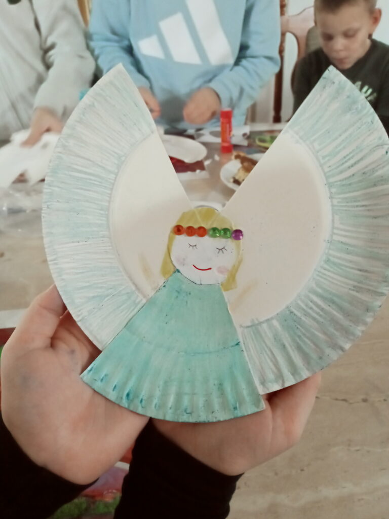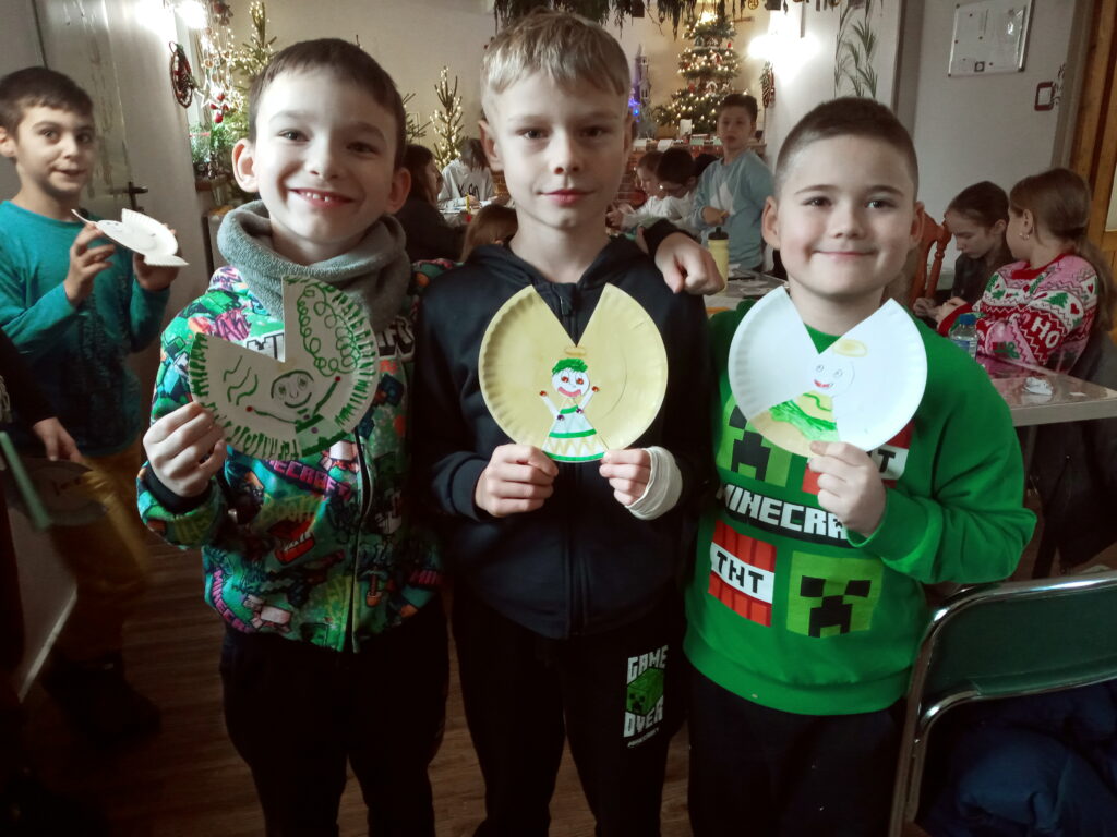 Następnie przystąpiliśmy do wykonania pracy manualnej – zrobiliśmy aniołki z papierowych talerzyków. Gdy wszyscy mieli już swojego świątecznego anioła, nastąpiła niespodzianka! Dzieci mogły wylosować z worka św. Mikołaja słodycze i kolorowe gumki do ścierania w kształcie różnych zwierzątek.