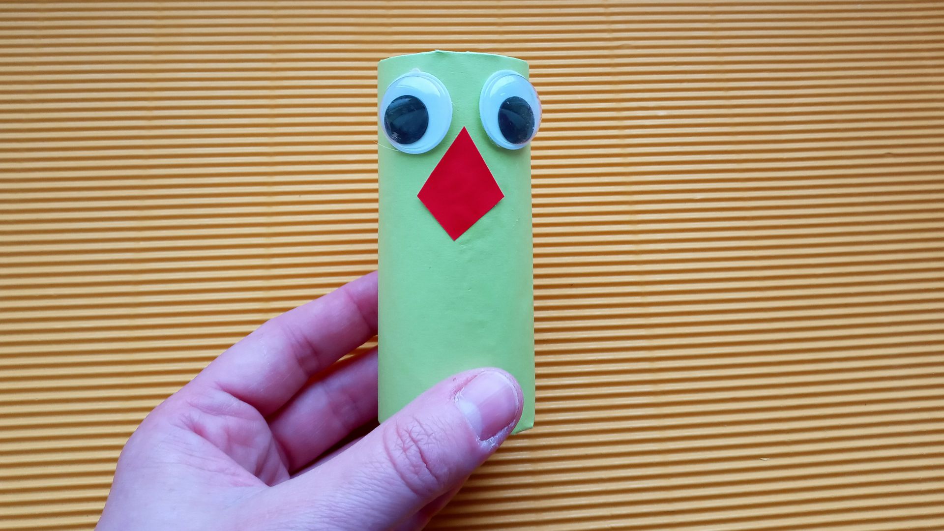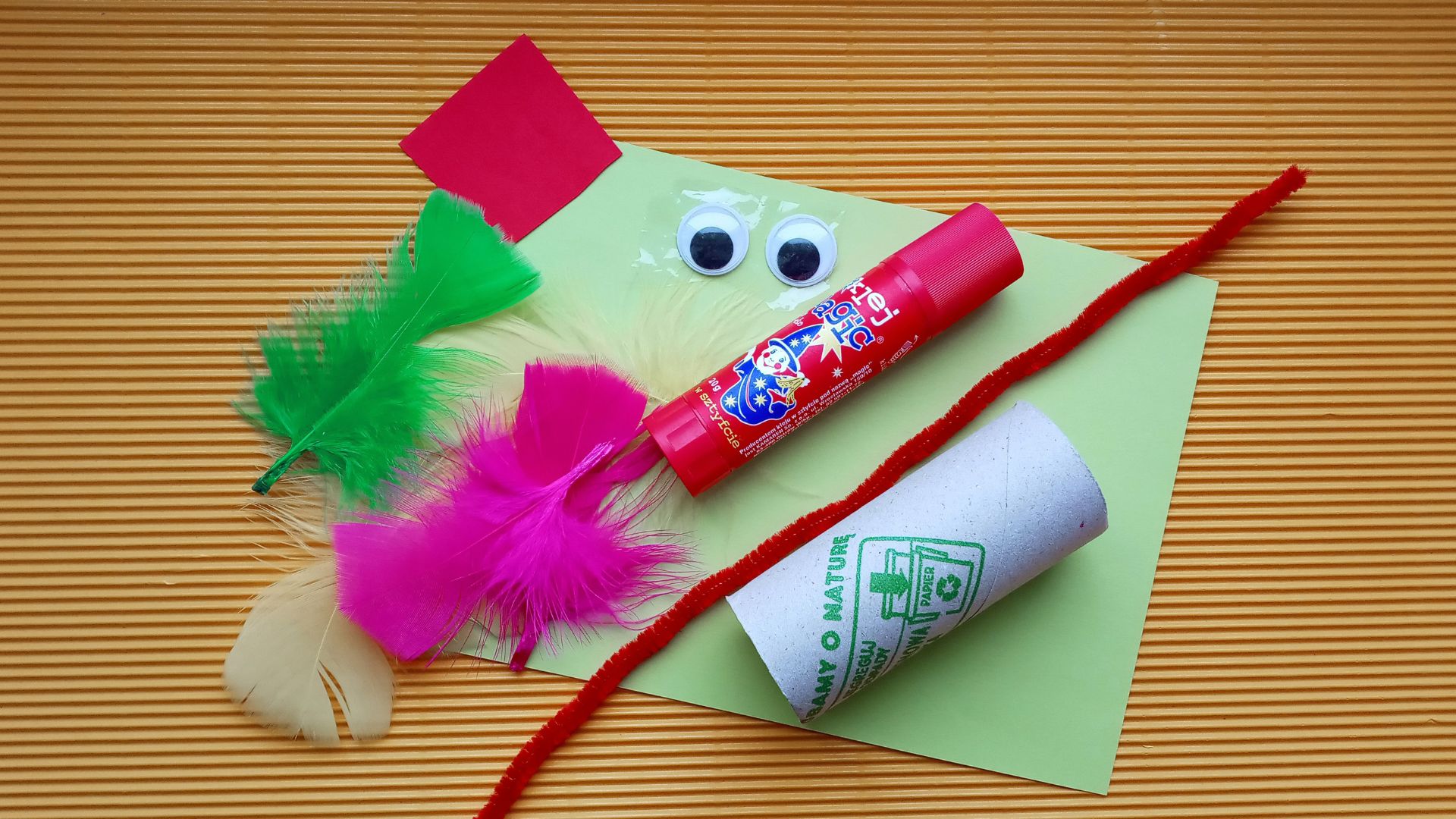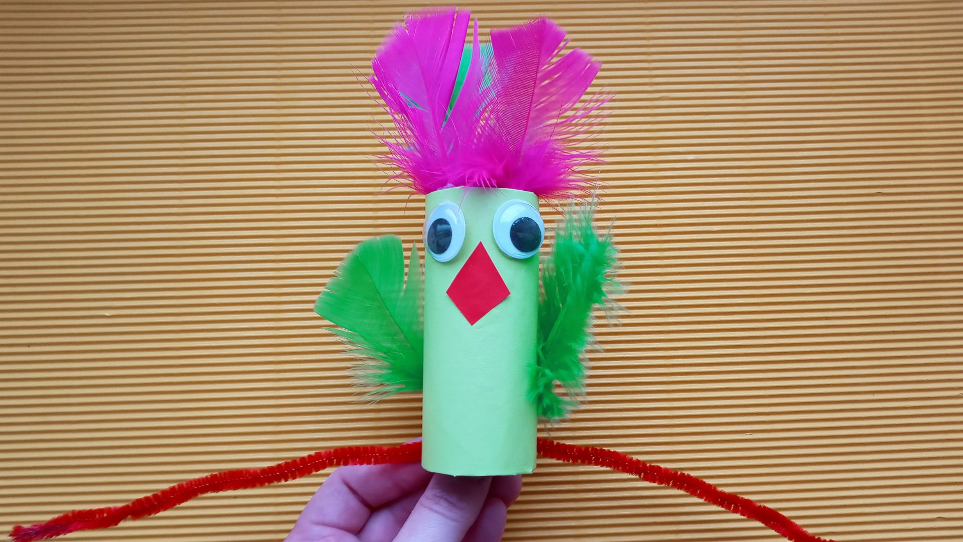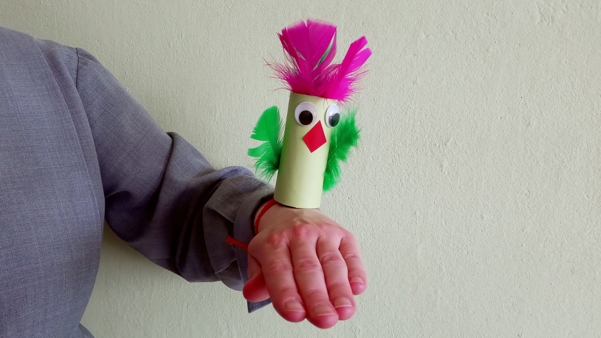 Tekturową rolkę obwijamy kolorową kartką i przyklejamy klejem. Następnie wystające końce papieru nacinamy i zaginamy do środa. Końcówki można również umocować klejem, by nie wychodziły z rolki. Następnie przyklejamy oczy, dziób wycięty z papieru oraz piórka. Na końcu mocujemy plastyczny drucik u doły rolki. Najlepiej wykorzystać do tego klej na gorąco. Teraz drucik możesz obwinąć wokół nadgarstka i ptak cudak będzie siedział u ciebie na ręku. Miłej zabawy!
