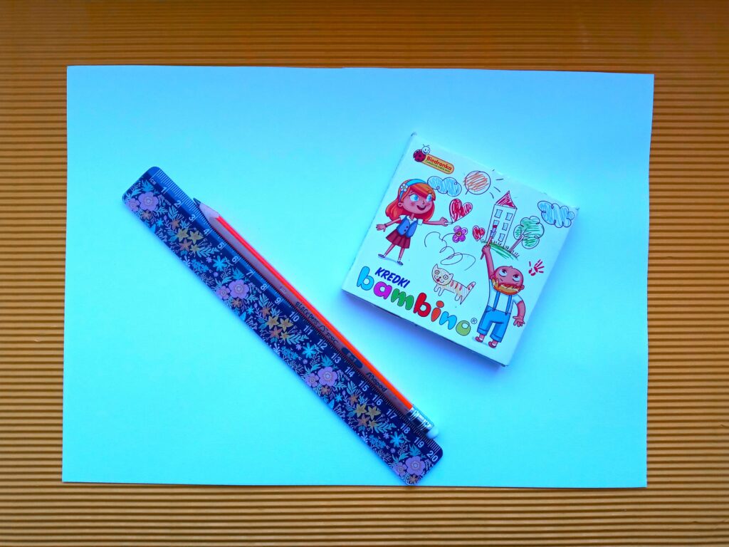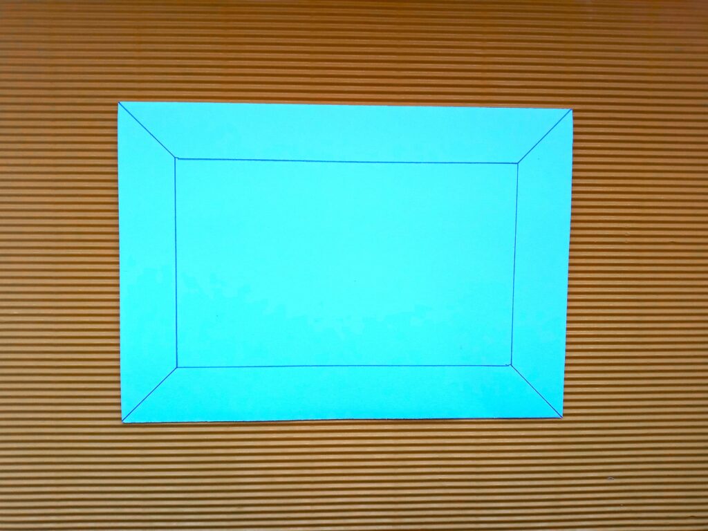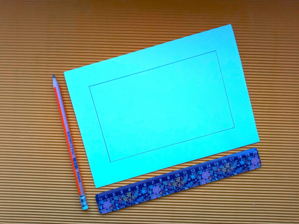 Kartkę z bloku technicznego składamy na pół, a następnie rysujemy ołówkiem prostokąt o wymiarach 16 cm/10cm. Wierzchołki prostokąta i kartki łączymy rysując linie, by powstał kształt ramki. Potem kolorujemy ramkę w dowolny sposób.