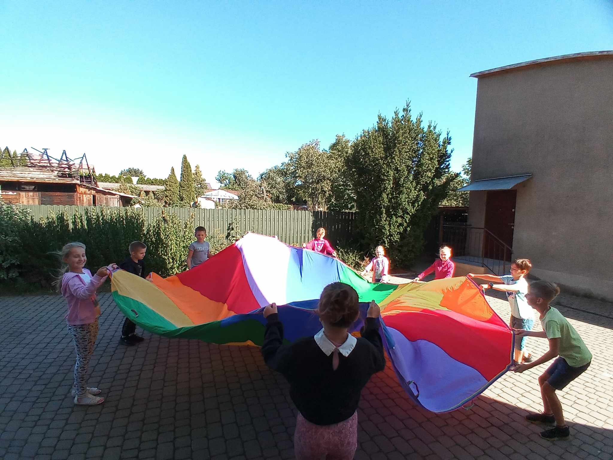 Po modlitwie przemieściliśmy się na podwórko i rozpoczęła się zabawa z chustą Klanzy. Najbardziej dzieciom podobało się chowanie się pod kolorową chustą, jak pod ogromnym parasolem, choć wiele radości sprawiło im również imitowanie burzy na morzu.