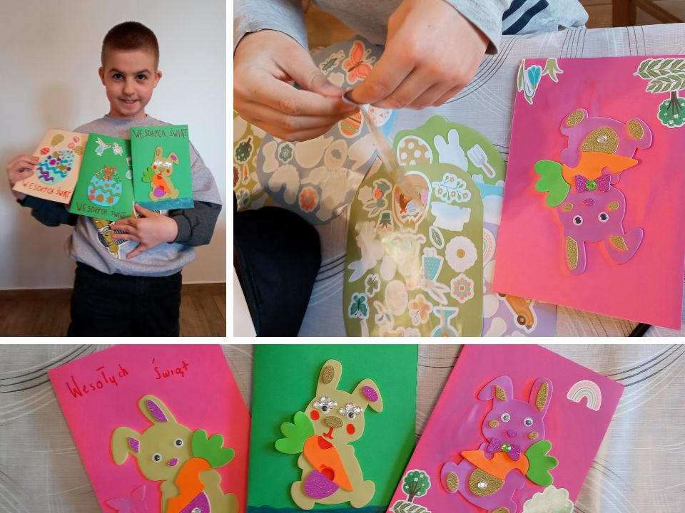 Materiały do wykonania wielkanocnych kartek ofiarowała nam p. Henryka Ptasińska (mama siostry Bogumiły). Gotowe formy z pianki w kształcie pisanek, zajączków, kurczaczka i wielkanocnego koszyka okazały się doskonałą ozdobą zewnętrznej strony kartek. Wewnątrz dzieci przygotowały miejsce na życzenia wielkanocne i ozdobiły je kolorowymi naklejkami.