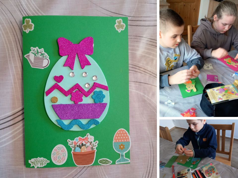 Podczas pracy rozmawialiśmy o tym, komu chcemy ofiarować świąteczne kartki oraz jakimi życzeniami chcemy obdarować naszych bliskich. Uzgodniliśmy, że chcemy przede wszystkim życzyć członkom naszych rodzin miłości, radości, wielu łask od Jezusa Zmartwychwstałego oraz zdrowia.