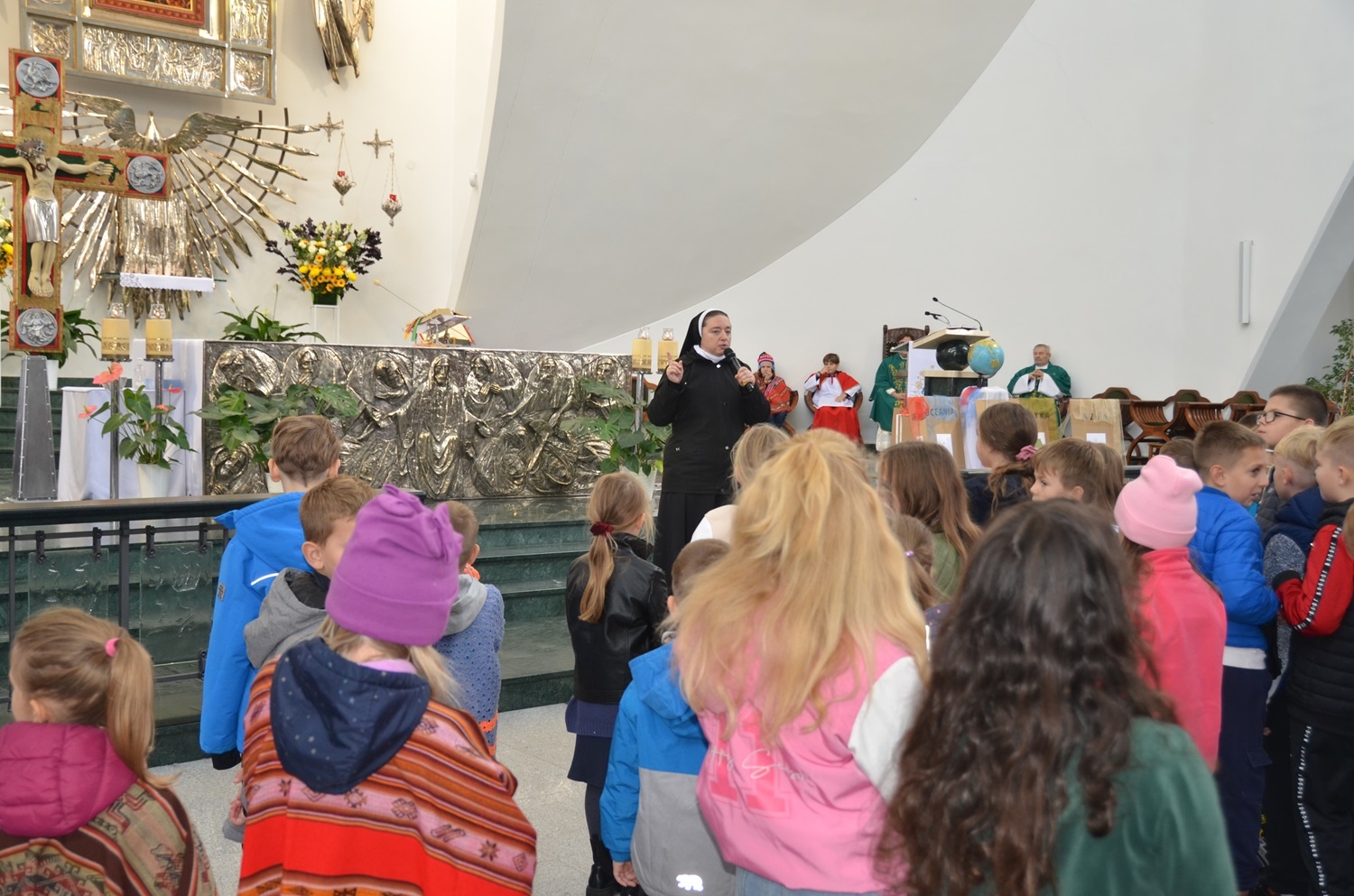 Na niedzielę misyjną mieliśmy przygotowaną liturgię słowa i małą animację misyjną podczas mszy świętej o godz. 11.00. Niektóre dzieci przyszły w pióropuszach, inne mogły się przebrać w stroje misyjne, które zostały przywiezione z Boliwii. Kolorów nie brakowało. Dzieci ze scholki zaśpiewały piosenkę misyjną „Alma Misionera”, którą przetłumaczono z języka hiszpańskiego. Nie obeszło się również bez piosenki w języku hiszpańskim.